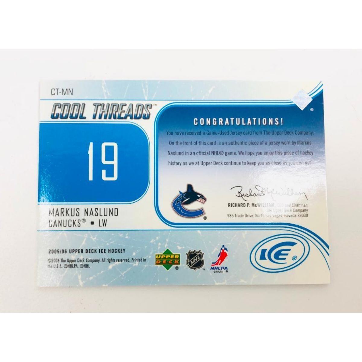 A 2005-06 Upper Deck Cool Threads CT-MN Game Used Jersey Patch Worn By Markus Naslund Of The Vancouver Canucks. Please View Photos For Further Details.Â