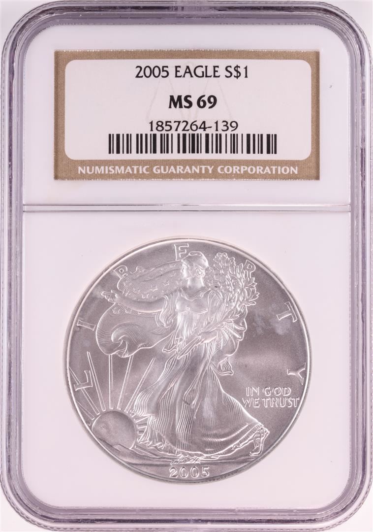 One 2005 $1 American Silver Eagle Coin NGC MS69. NGC Certified.