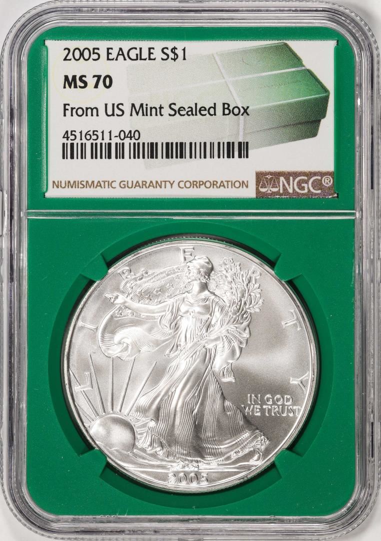 2005 $1 American Silver Eagle Coin NGC MS70 From US Mint Sealed Box Green Core
