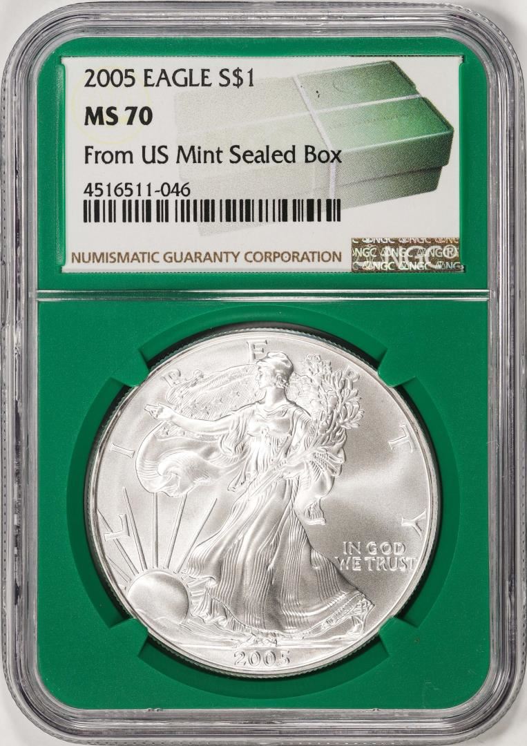 2005 $1 American Silver Eagle Coin NGC MS70 From US Mint Sealed Box Green Core