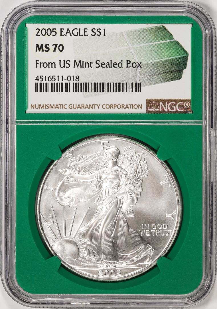 2005 $1 American Silver Eagle Coin NGC MS70 From US Mint Sealed Box Green Core