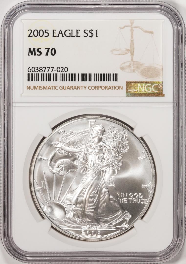 One 2005 $1 American Silver Eagle Coin NGC MS70. NGC Certified.