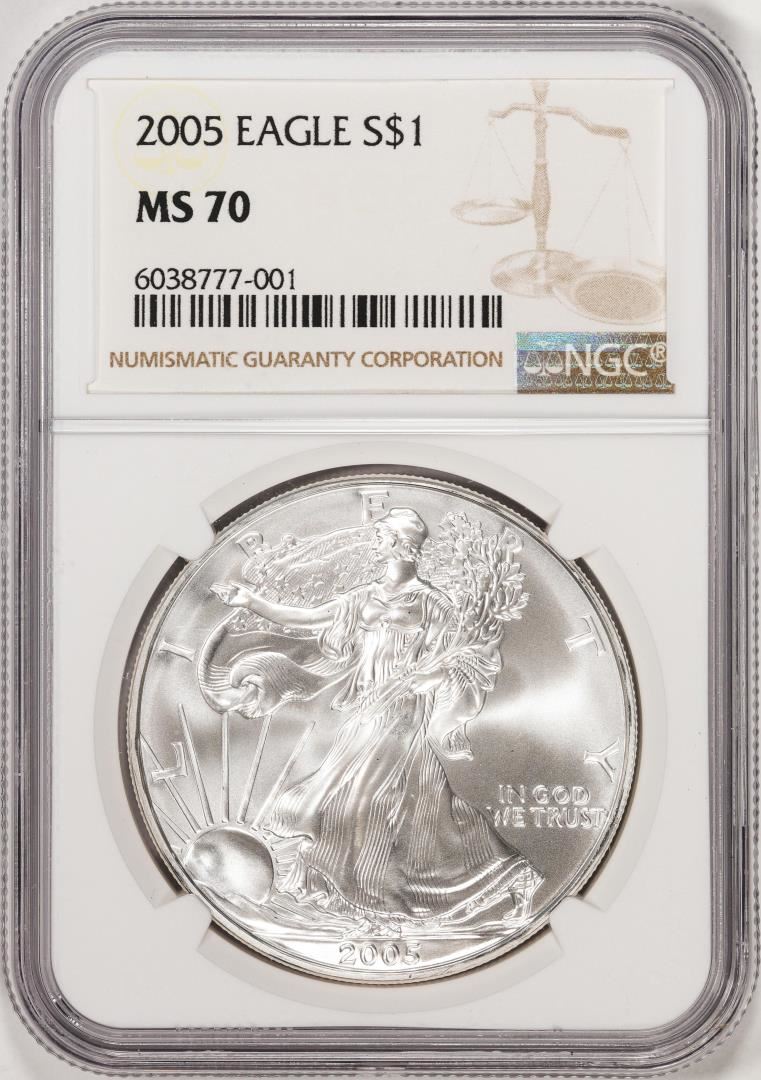 One 2005 $1 American Silver Eagle Coin NGC MS70. NGC Certified.