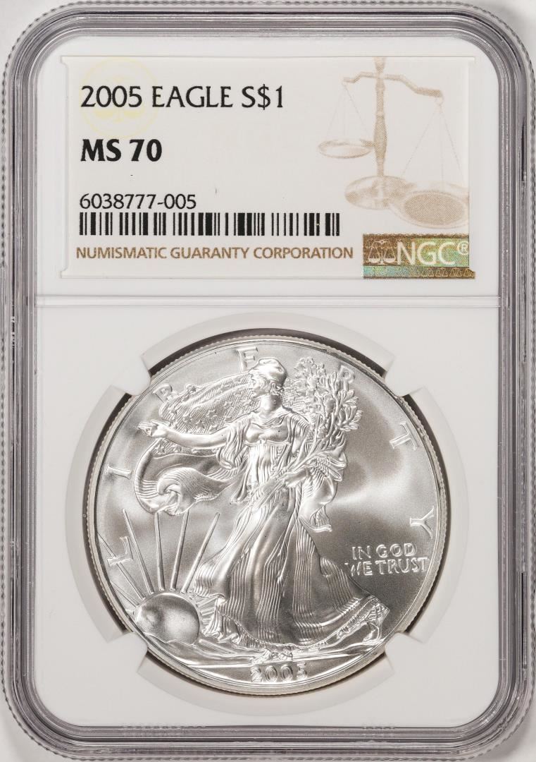 One 2005 $1 American Silver Eagle Coin NGC MS70. NGC Certified.