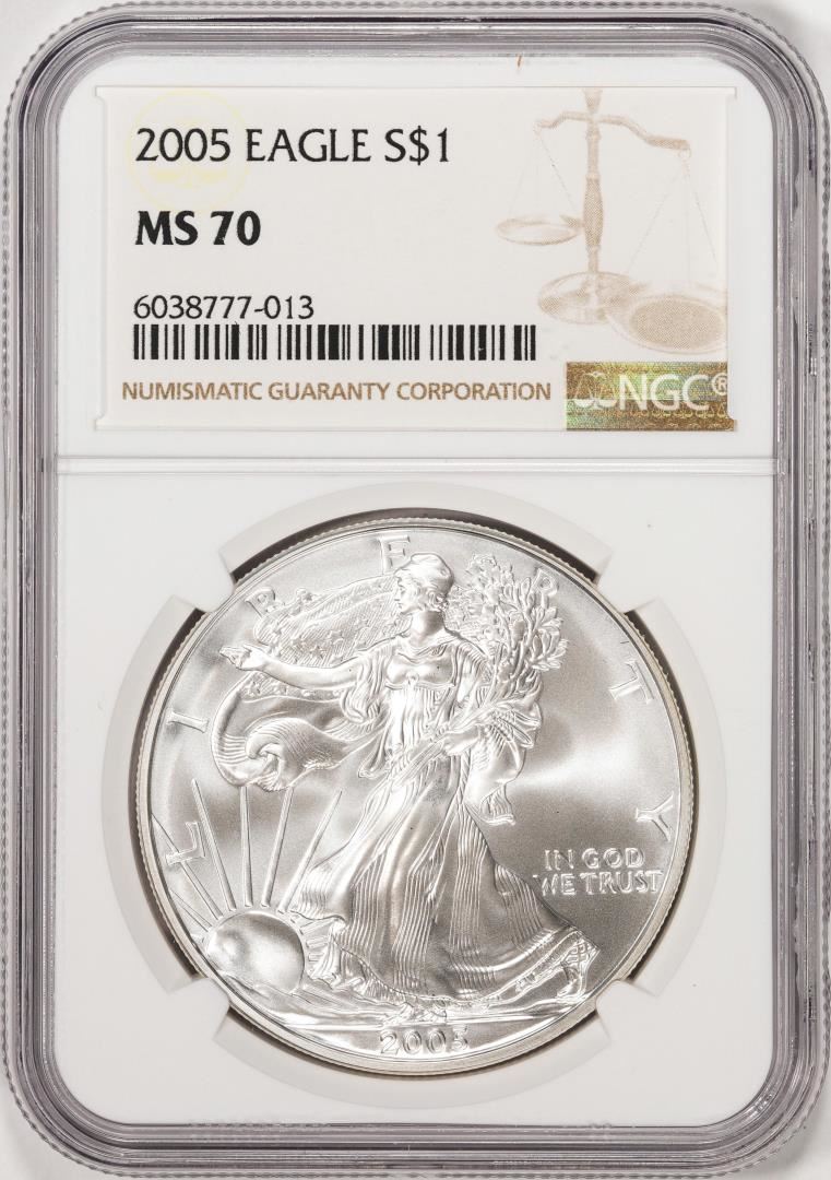 One 2005 $1 American Silver Eagle Coin NGC MS70. NGC Certified.