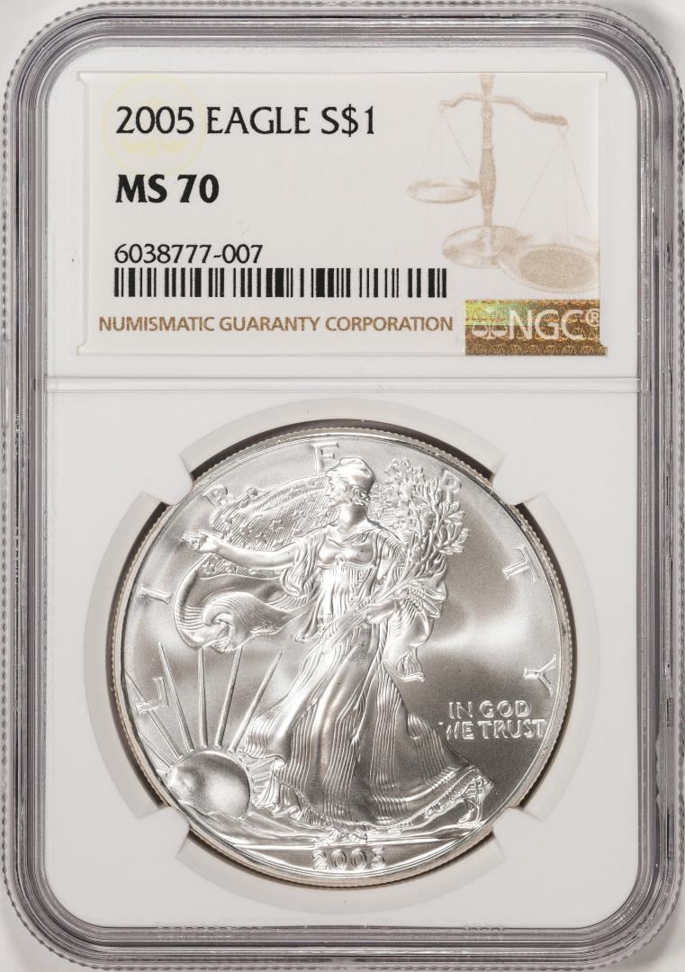 One 2005 $1 American Silver Eagle Coin NGC MS70. NGC Certified.
