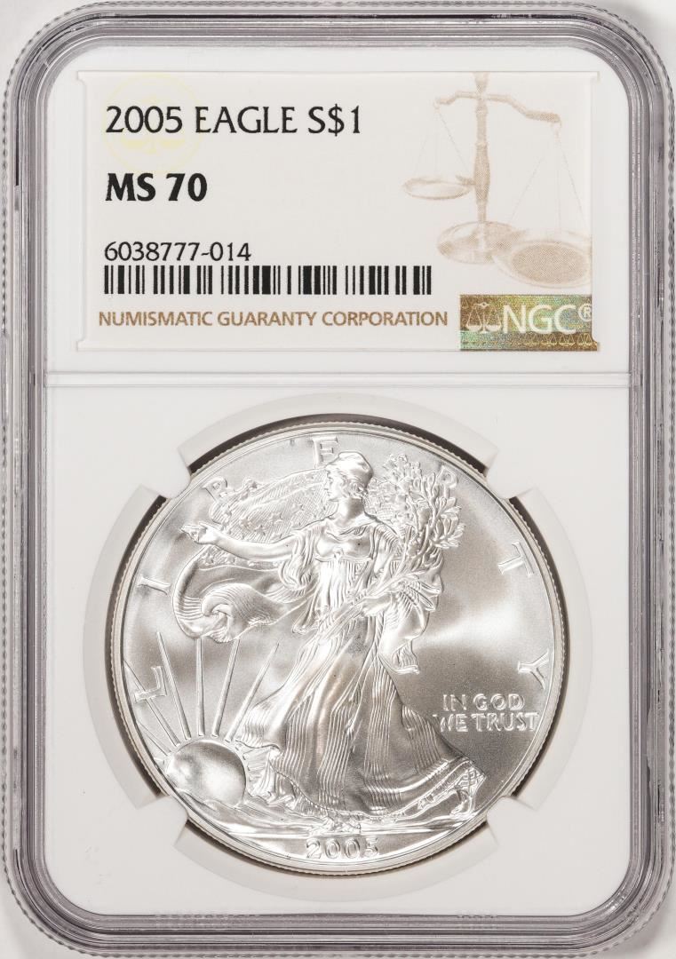 One 2005 $1 American Silver Eagle Coin NGC MS70. NGC Certified.