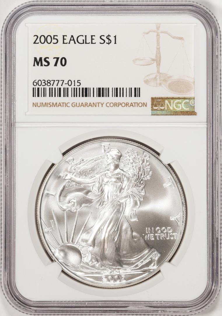One 2005 $1 American Silver Eagle Coin NGC MS70. NGC Certified.