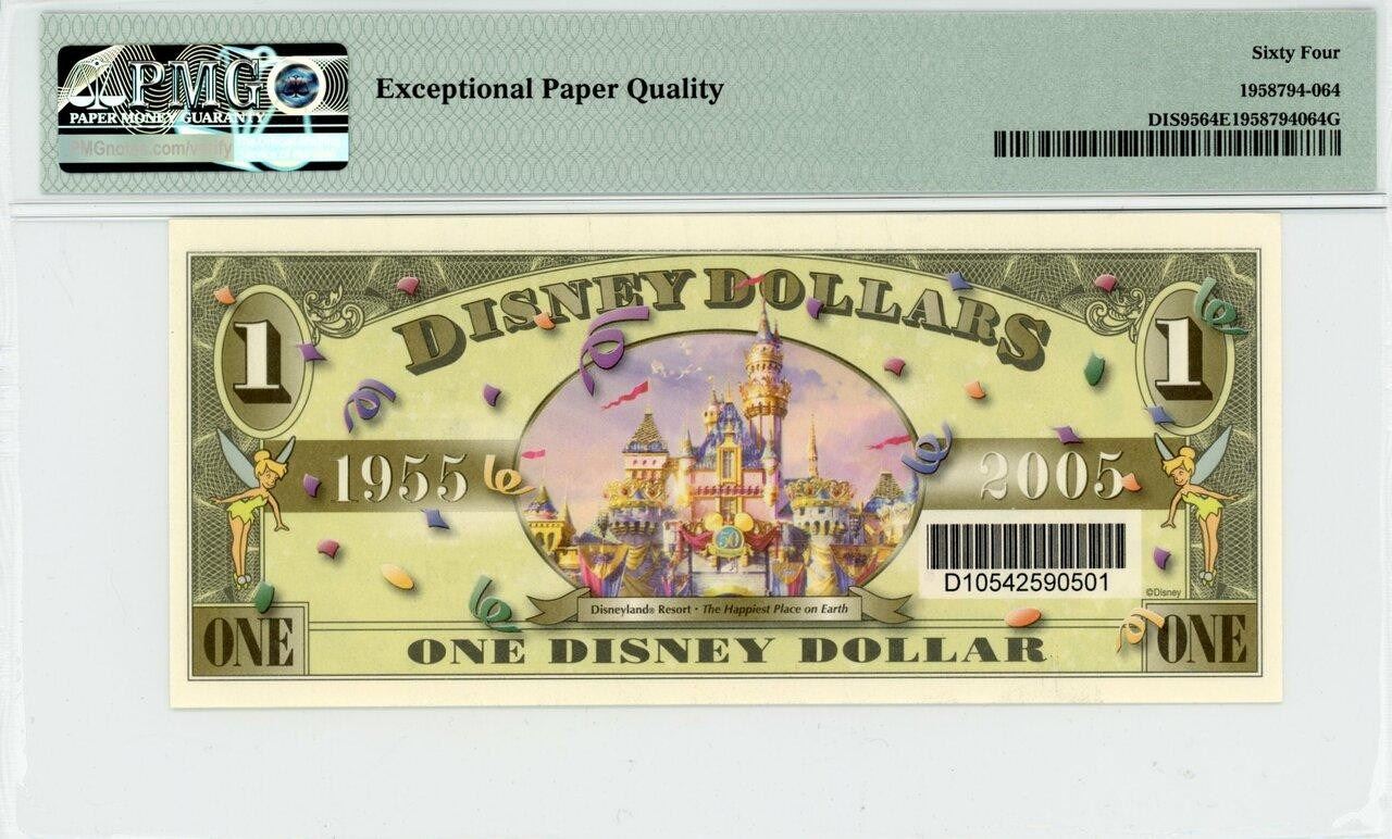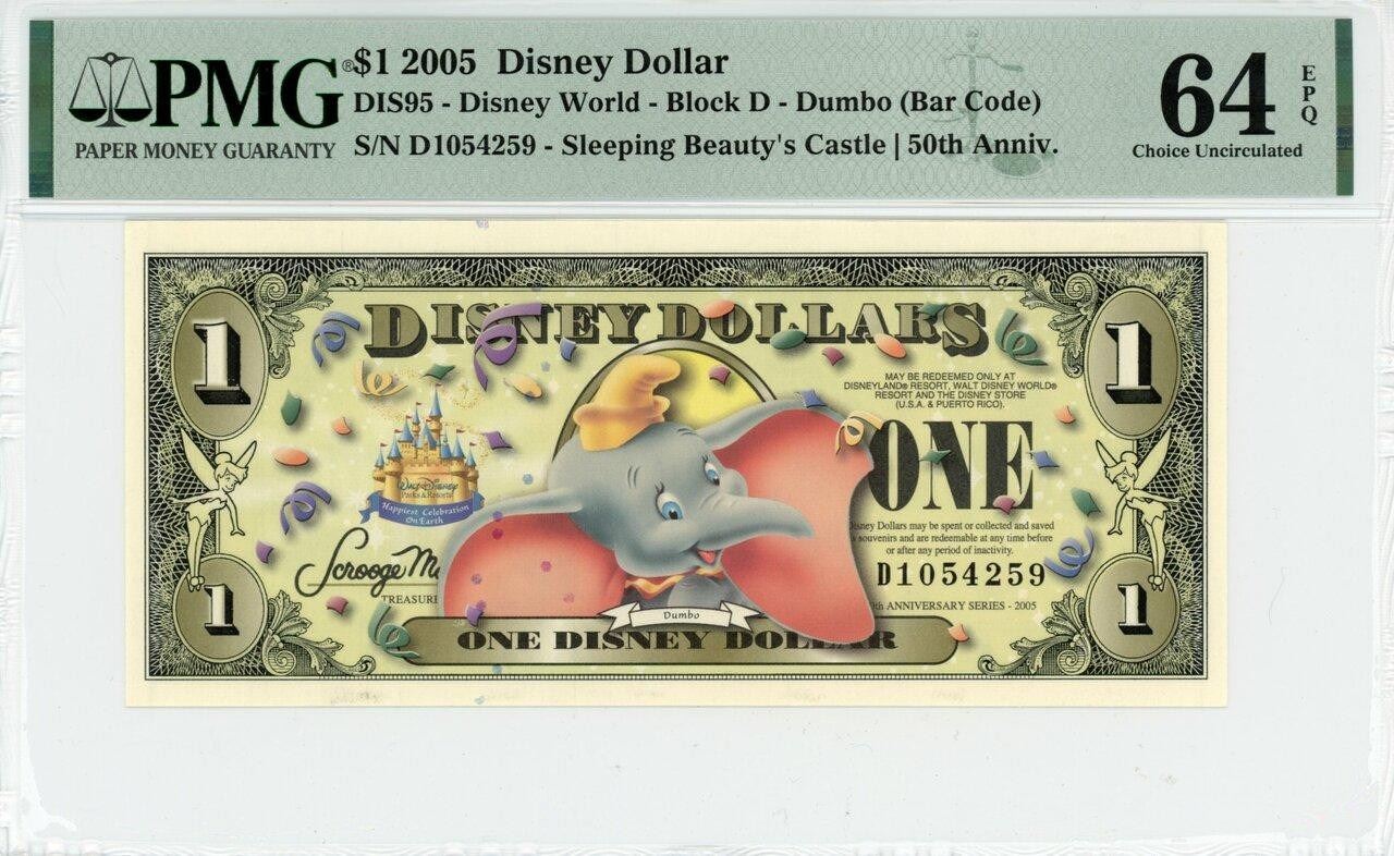 One 2005 $1 Dumbo Disney Dollar PMG 64EPQ.