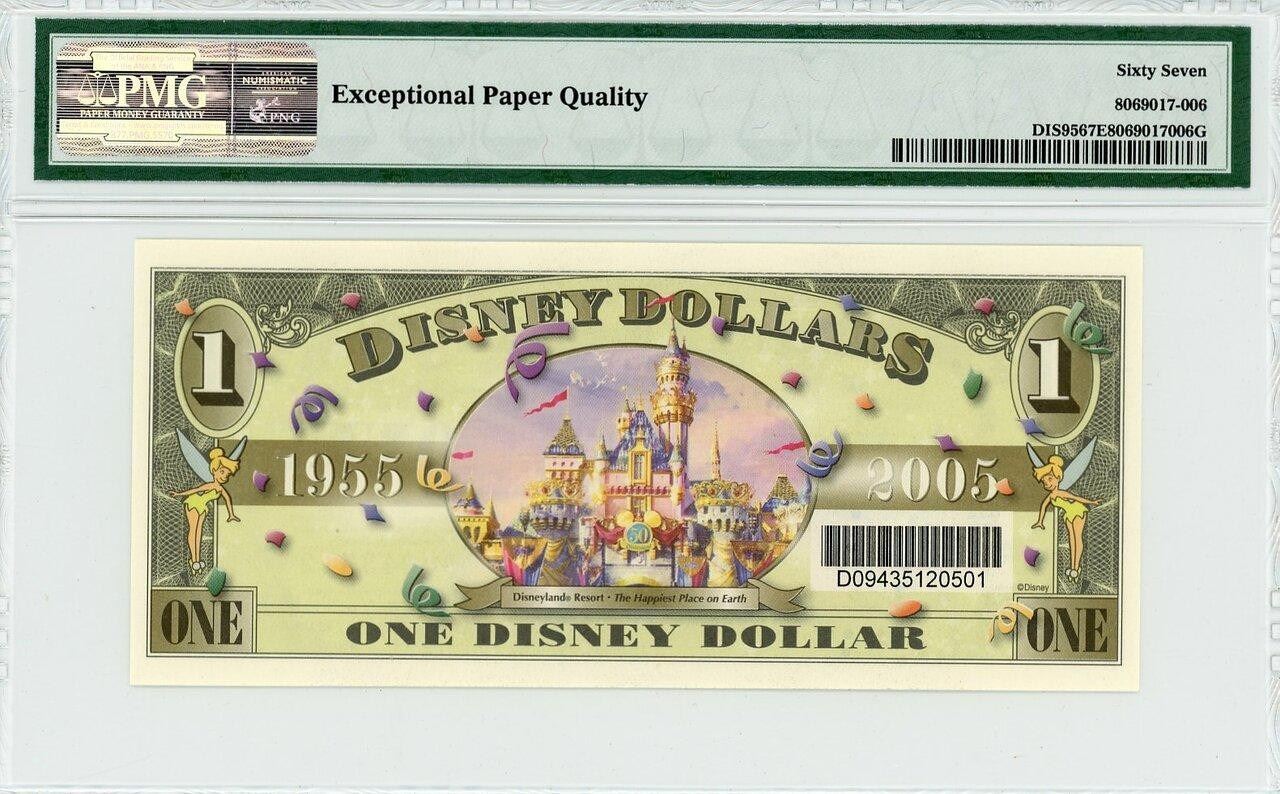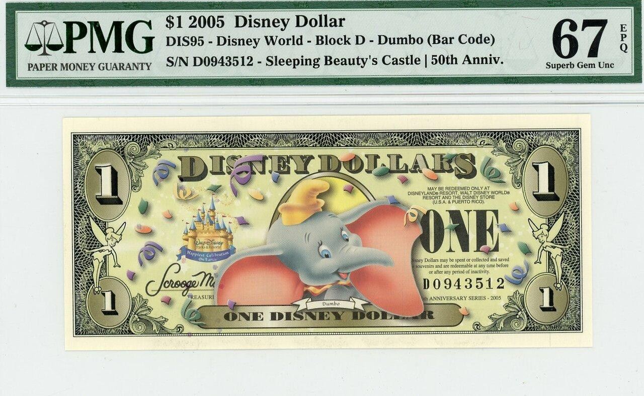 One 2005 $1 Dumbo Disney Dollar PMG 67EPQ.