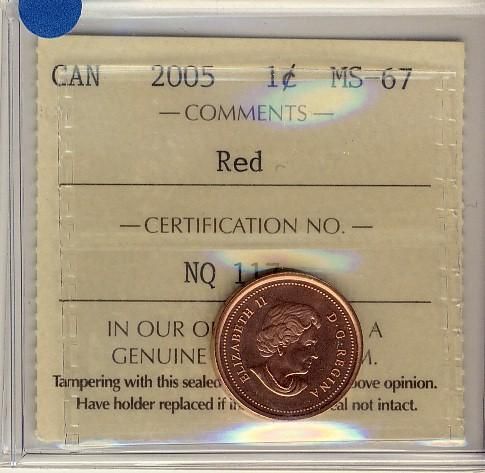 2005 1¢ ICCS MS67 Full Red, A superb GEM example.
