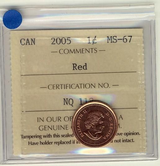 2005 1¢ ICCS MS67 Full Red, A superb GEM example.