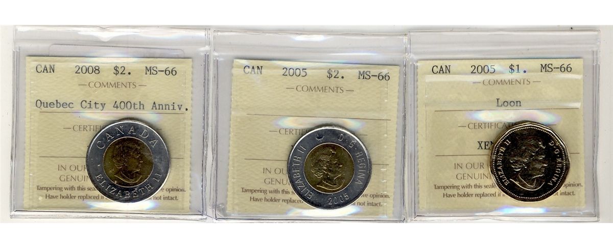 2005 $1 Loon, 2005 $2 & 2008 $2 Quebec City all ICCS MS66. Lot of 3 coins.