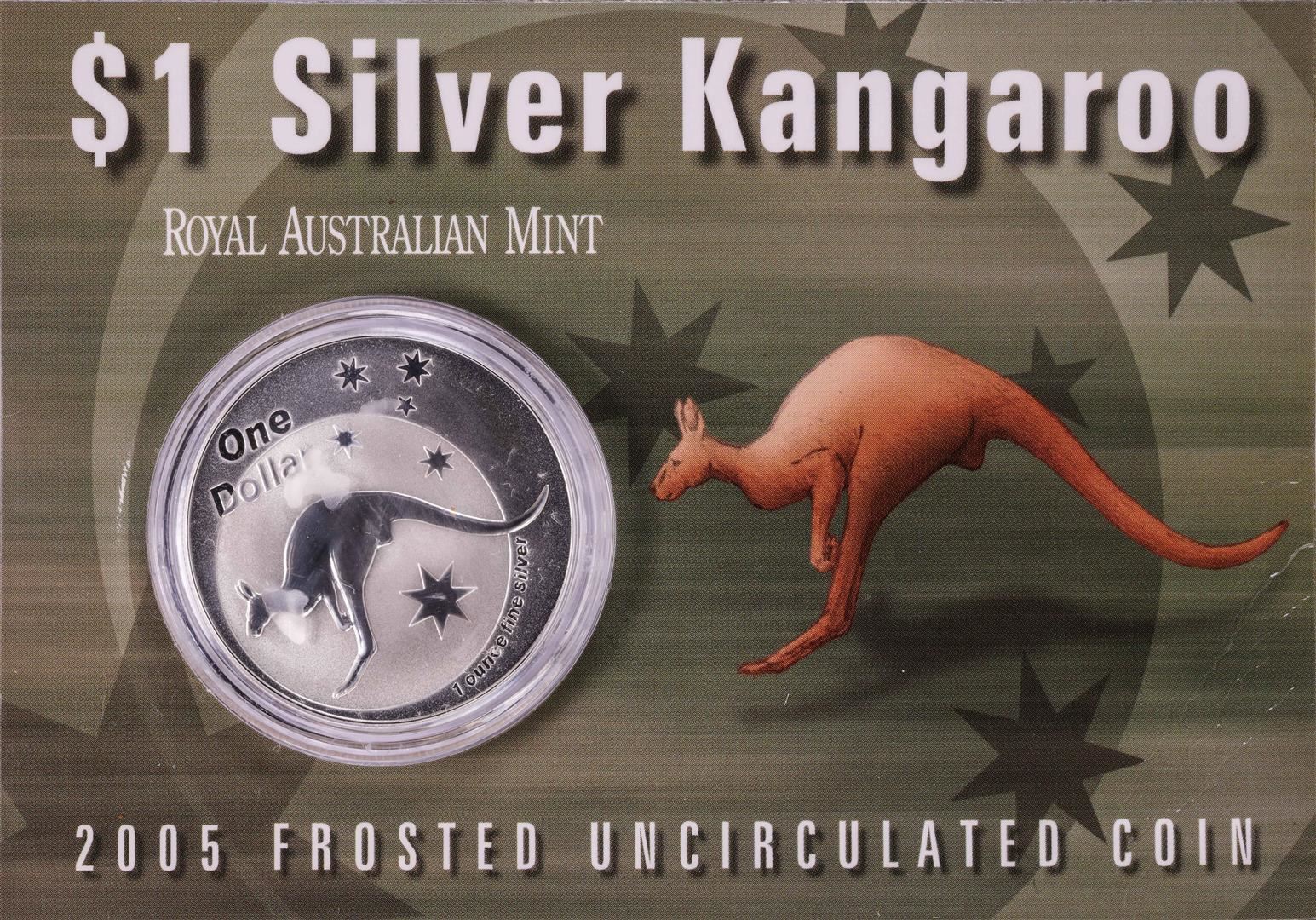 One 2005 $1 Silver Kangaroo Frosted Uncirculated Coin.