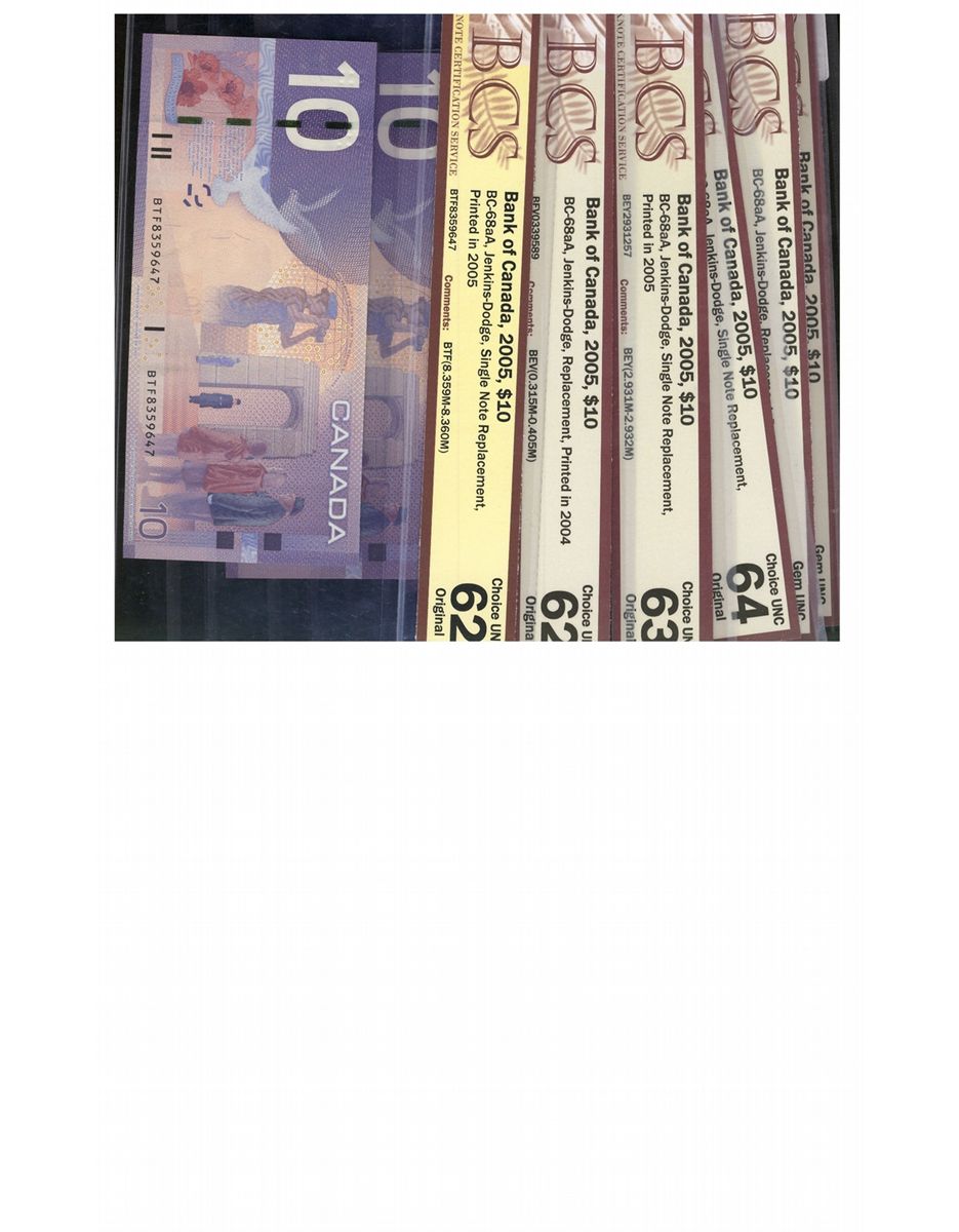 2005 $10.00 BC-68aA, #BTF (8.359M-8.360M), #BEV(0.315M-0.405M) CH UNC62, BEY(2.931M-2.932M) CH UNC-63, #BTG(7.777M-7.780M) CH UNC-64, #BTG(8.220M-8.300M) & BTL(2.280M-2.480M) Gem UNC-65. Lot of 6 notes all BCS graded original.