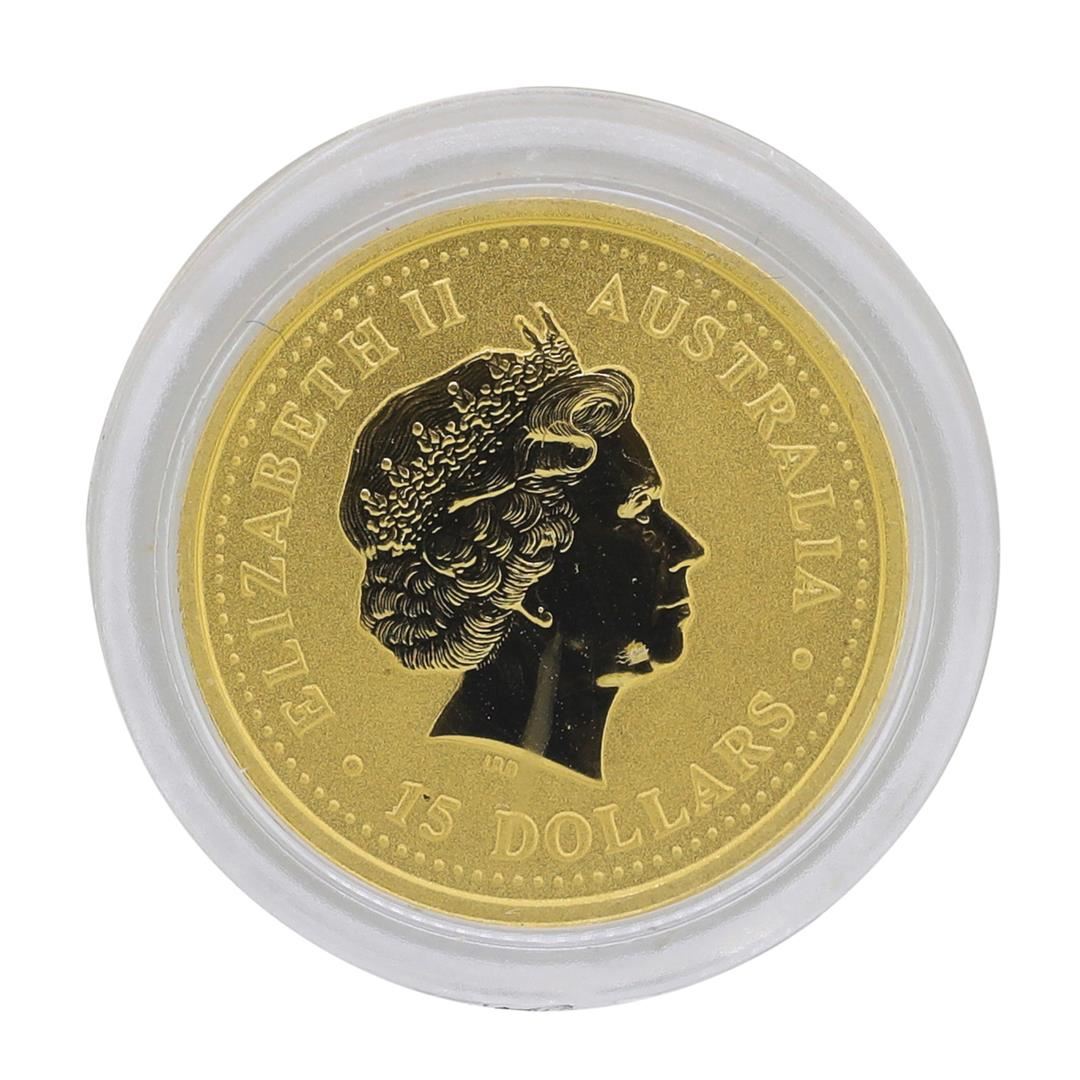 One 2005 $15 Australia Lunar Year of the Rooster 1/10 oz. Gold Coin.