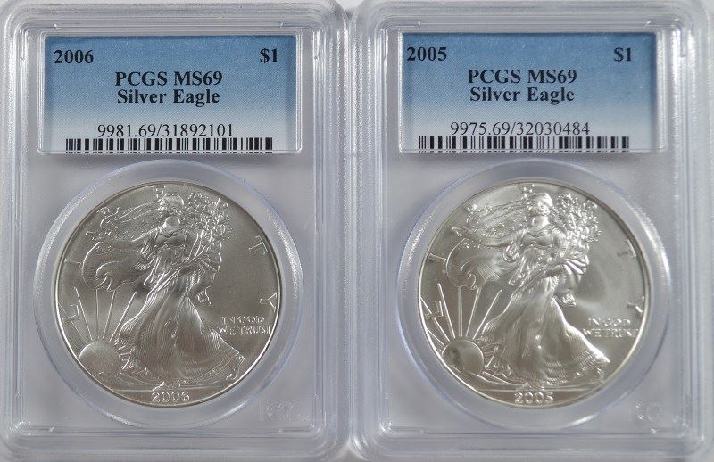 2005 & 2006 AMERICAN SILVER EAGLES, PCGS MS-69