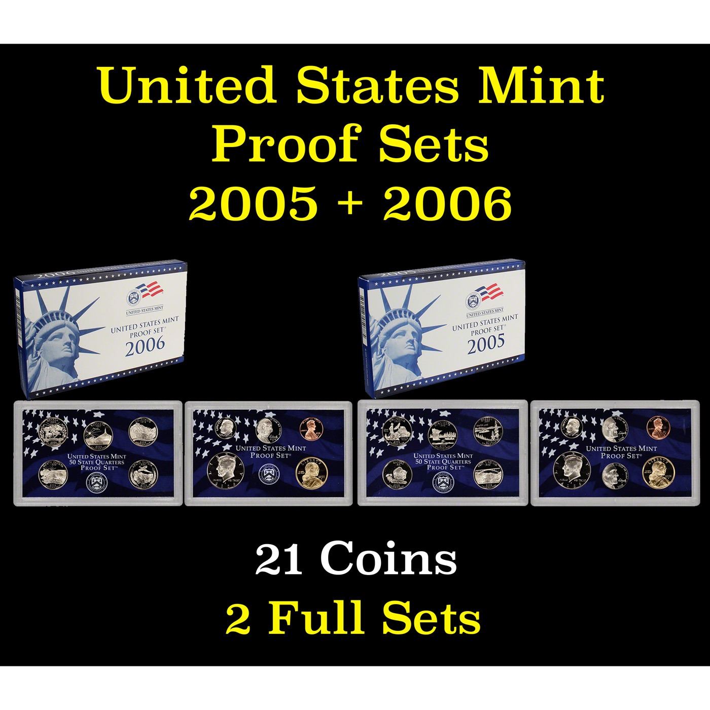 2005 & 2006 United States Mint Proof Set 20 coins. A group of 2 United States Mint proof sets, for the year 2005 & 2006. Both sets contains 5 Proof State Quarters, a Proof Half Dollar, a Proof Dime, as well as 3 additional Proof coins Including the Sacagawea Proof Dollar coin. Complete with Original Packaging and COA.
