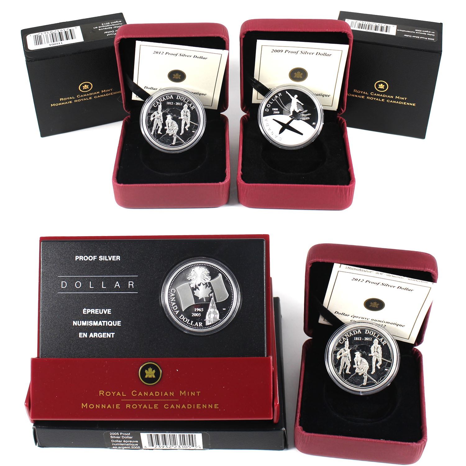 2005-2012 Canada Commemorative Proof Silver Dollar Collection (TAX Exempt). You will receive the 2005 40th Anniversary of the Flag Fine Silver Proof, 2009 100th Anniversary of Flight Sterling Silver Proof, and 2x 2012 War of 1812 Bicentennial Fine Silver Proof. Please note one 2012 is missing outer sleeve. 4pcs.