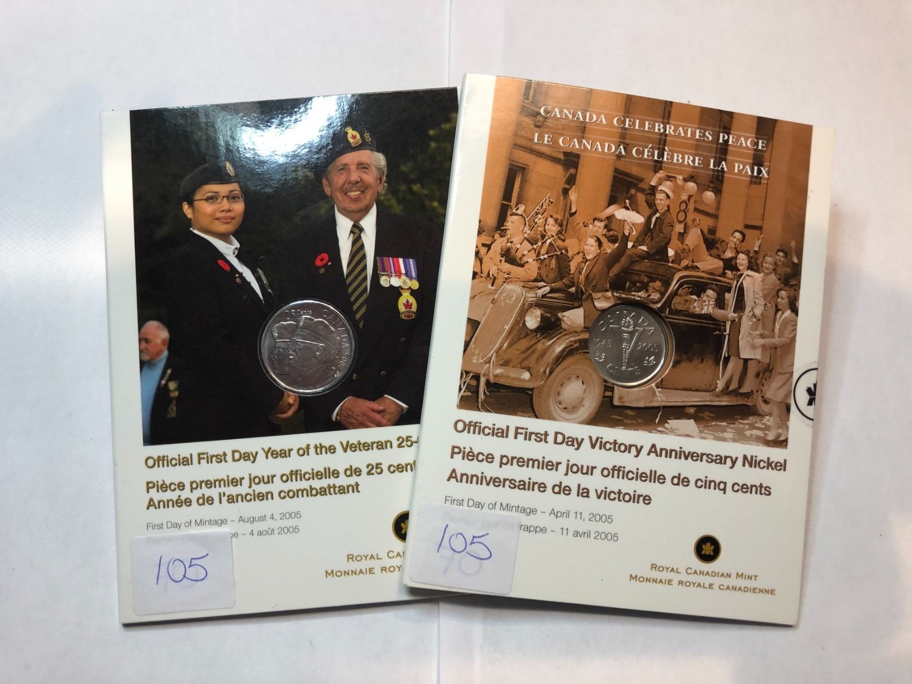 2005/2018 Royal Canadian Mint Coins 2005 - Official First Day Victory Nickel 2005 - Official First Day Year of the Veteran 25 cent coin 2005 - Royal Mint 2 Pounds Silver Proof Coin- this coin is 92,5% sterling silver and weighs 12 grams 2018 - Never Forgotten Coin Set