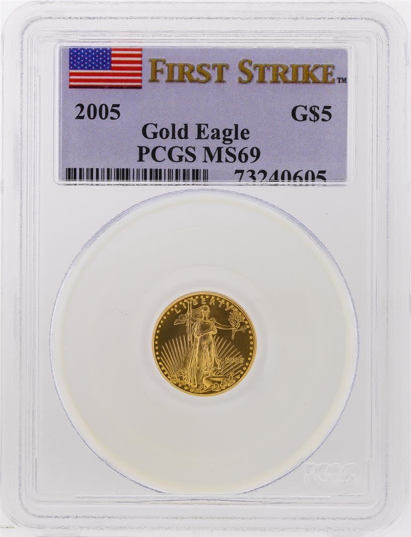One 2005 $5 American Gold Eagle Coin PCGS Graded First Strike MS69. PCGS Graded.