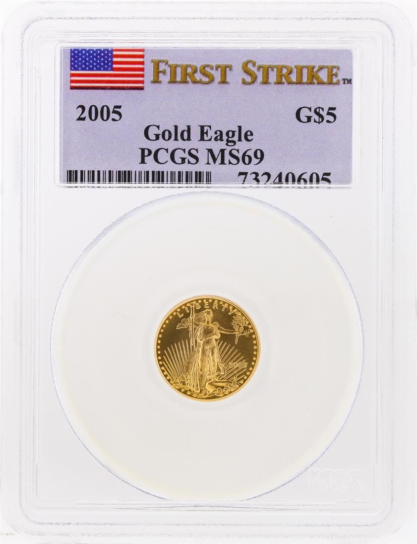 One 2005 $5 American Gold Eagle Coin PCGS Graded First Strike MS69. PCGS Graded.