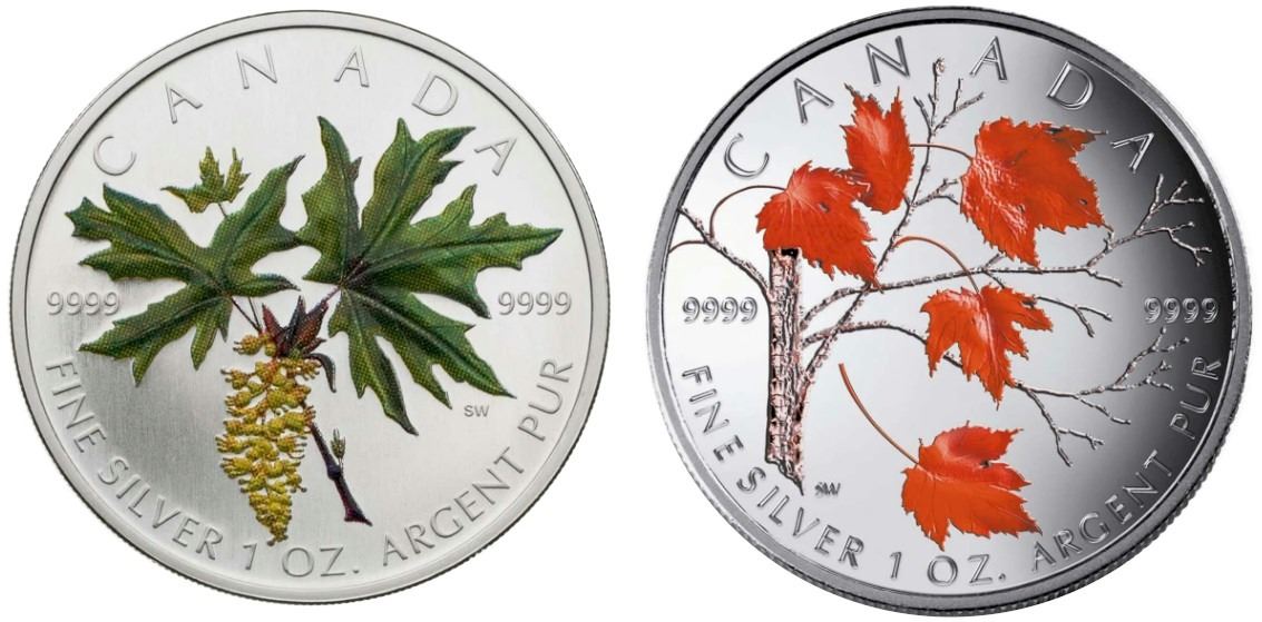 2005 $5 Coloured Maple Leaf: Bigleaf Maple & 2004 $5 Coloured Maple Leaf: Winter - Lot of 3 Pure Silver Coins. Tax Exempt.