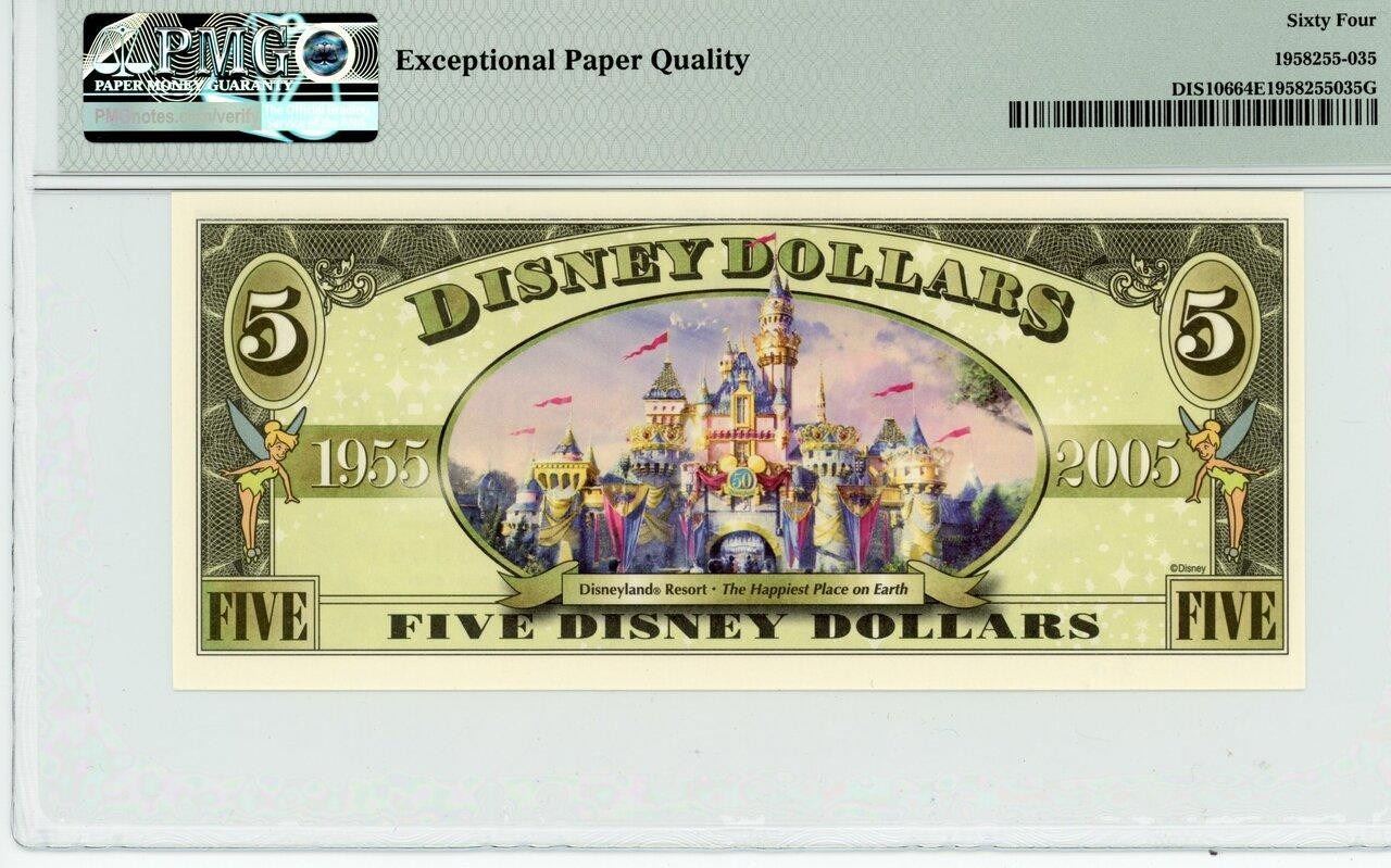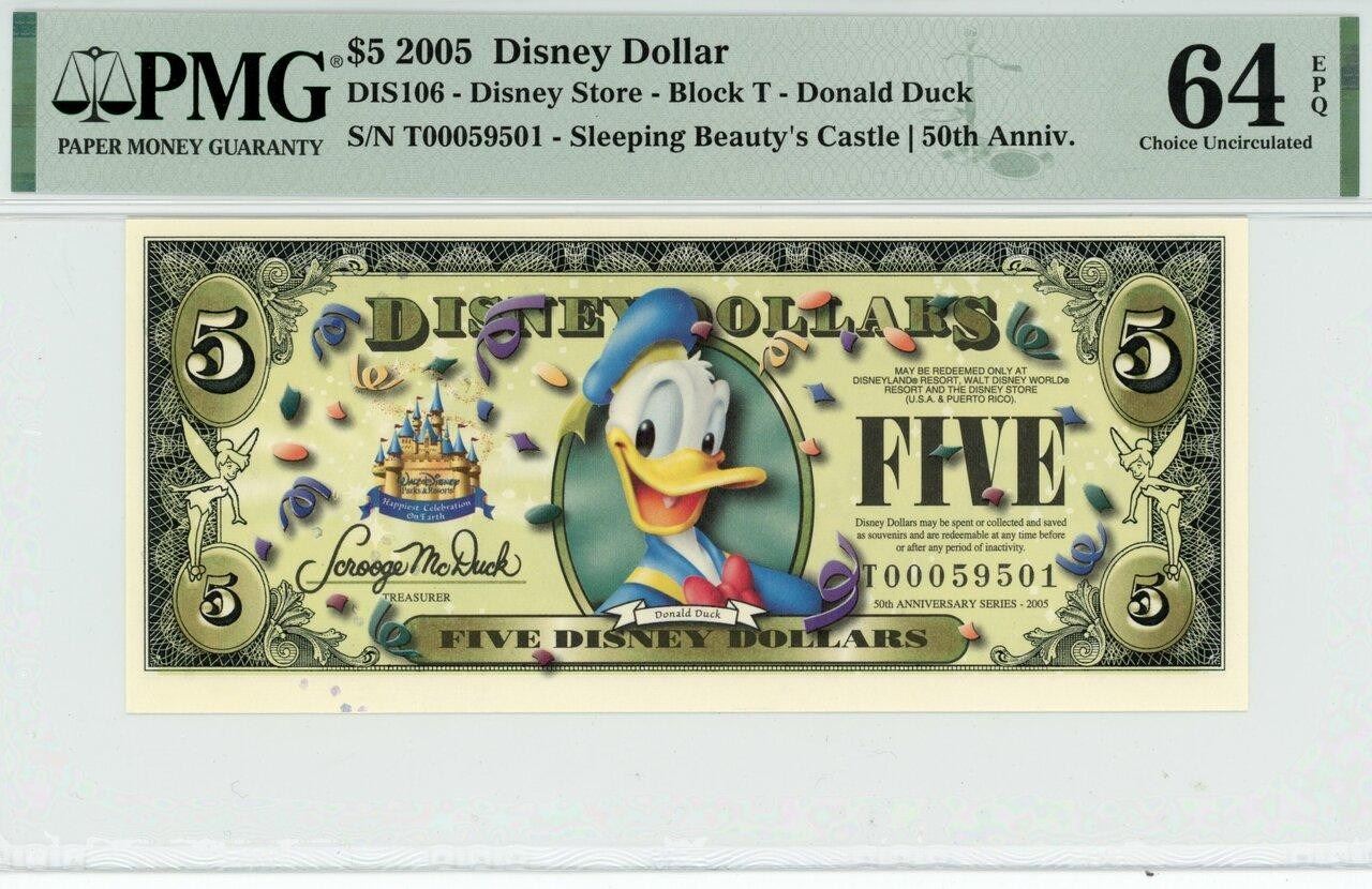 One 2005 $5 Donald Duck Disney Dollar PMG 64EPQ.
