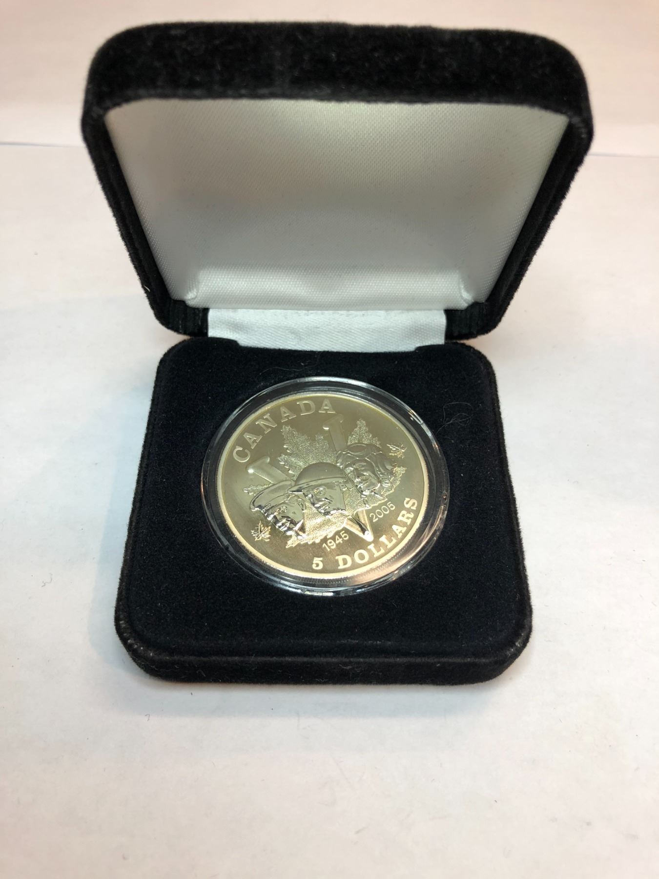 2005 $5 Royal Canadian Mint $5 Fine Silver Coin This $5 coin is 99.99% fine silver and weighs 31.39 grams The design features 60th Anniversary of the end of WWII