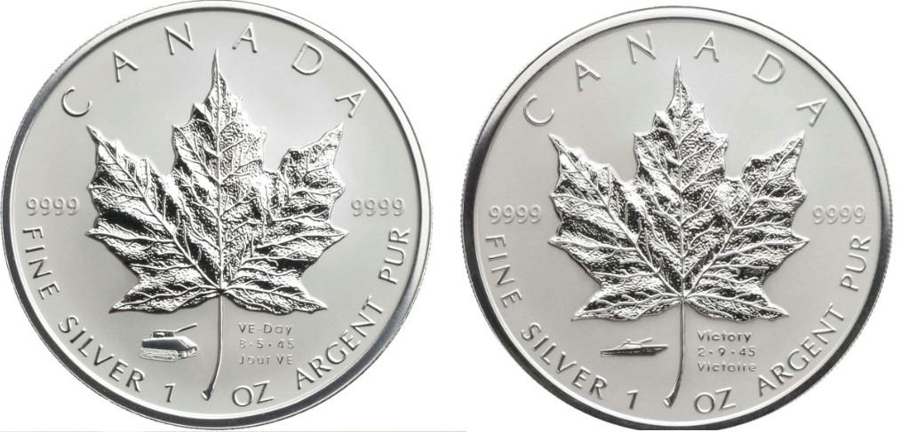 2005 $5 Silver Maple Leaf V-J Day and V-E Day, lot of 2 coins.