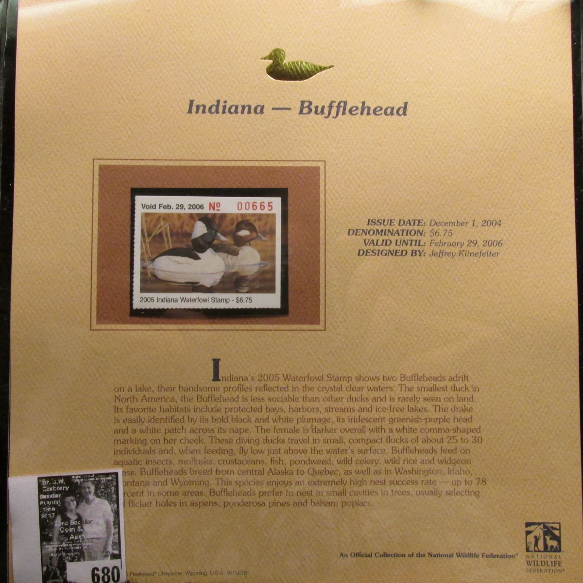 2005 $6.75 Indiana Waterfowl Stamp depicting the Bufflehead, Absolute mint condition with literature and displayed in a plastic page.