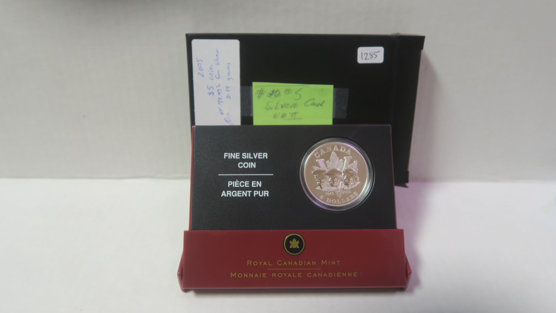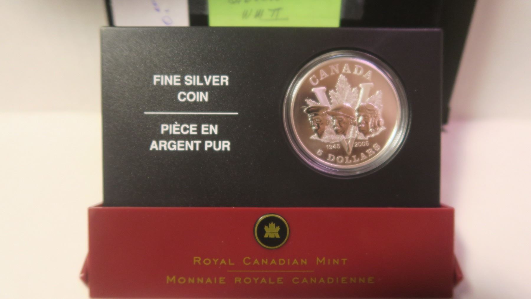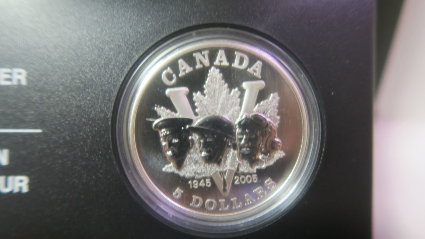 2005 60th Anniversary of the End of the Second World War $5. 99.99% pure Silver. Specimen. Housed in its original case & box of issue.