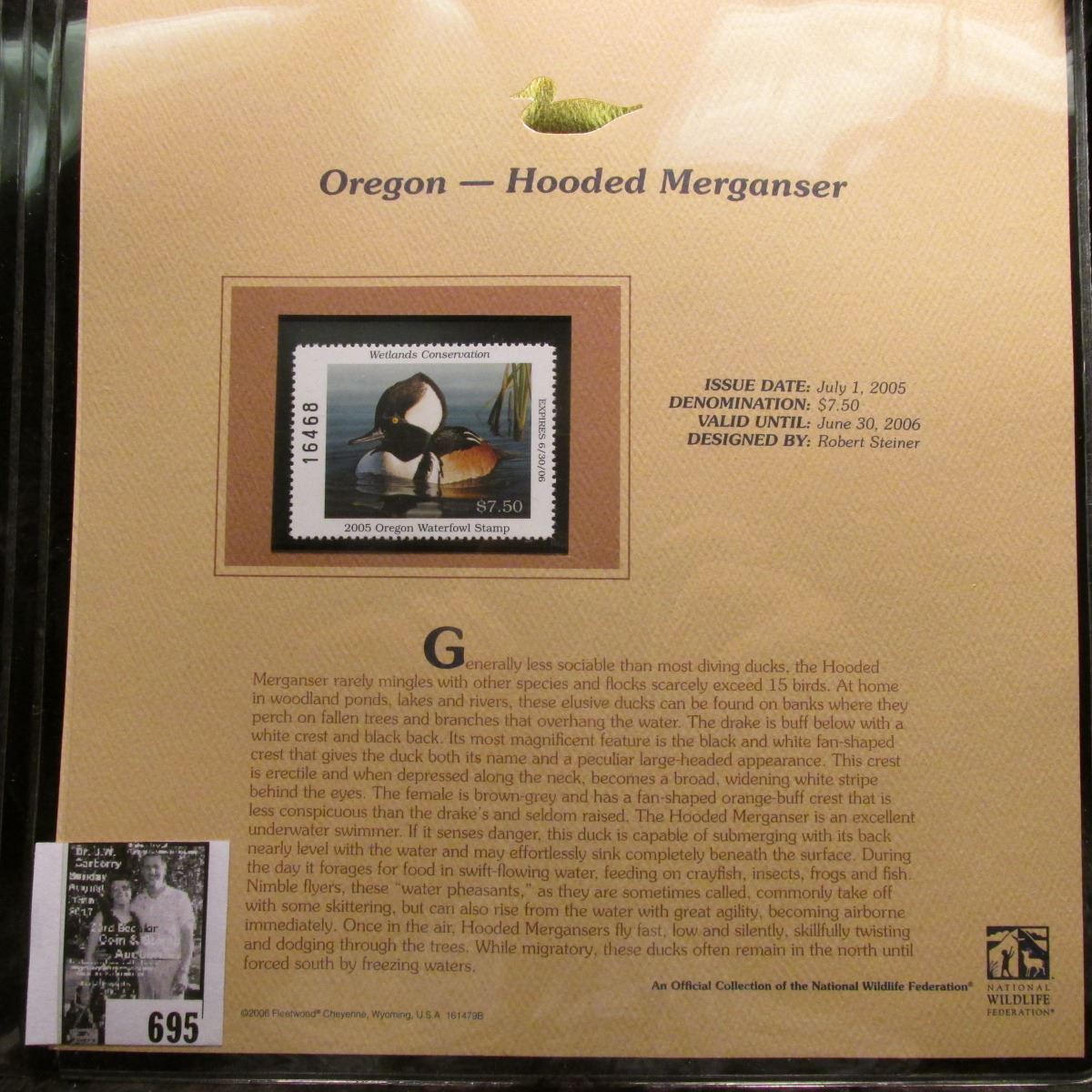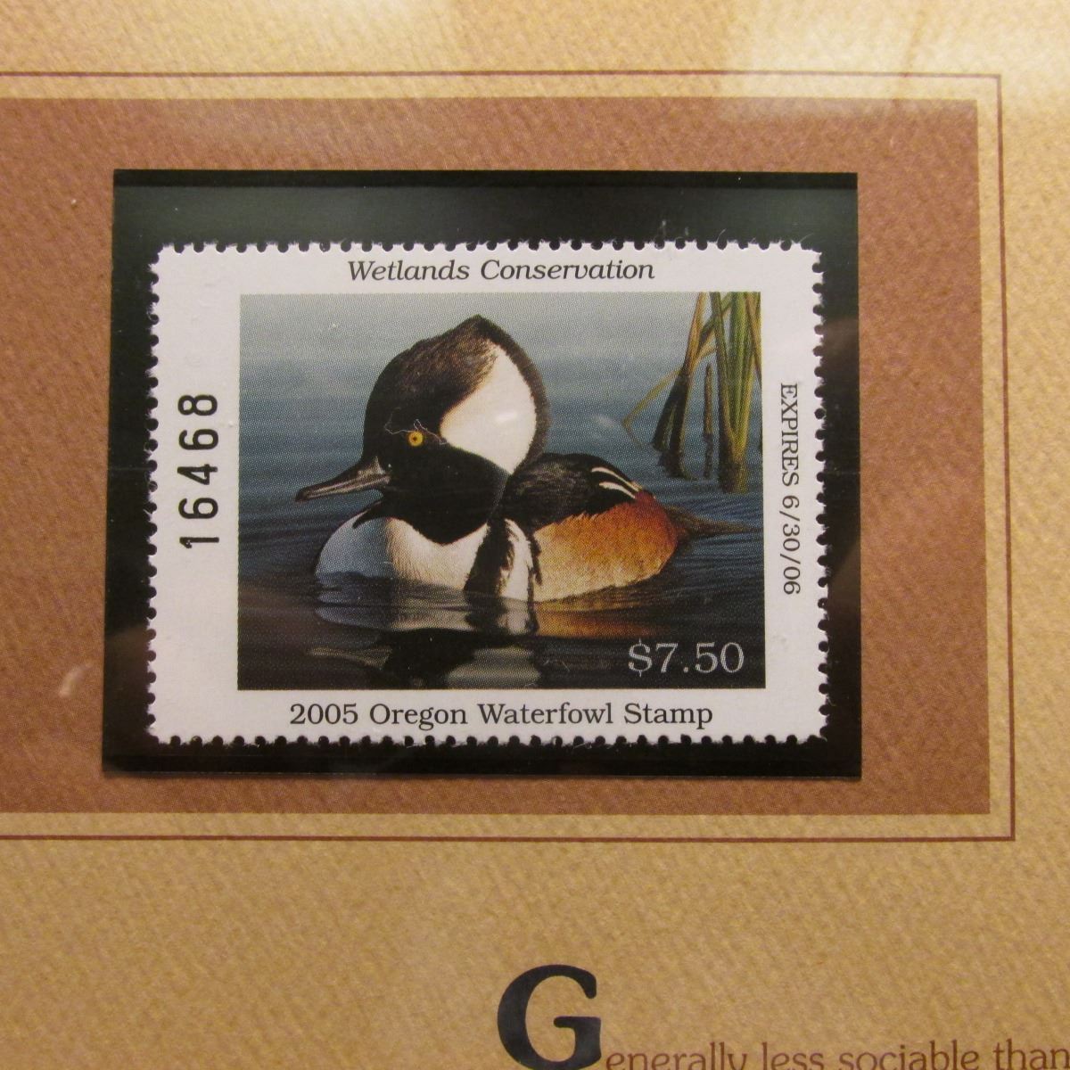 2005 $7.50 Oregon Waterfowl Stamp depicting the Hooded Merganser, Absolute mint condition with literature and displayed in a plastic page.