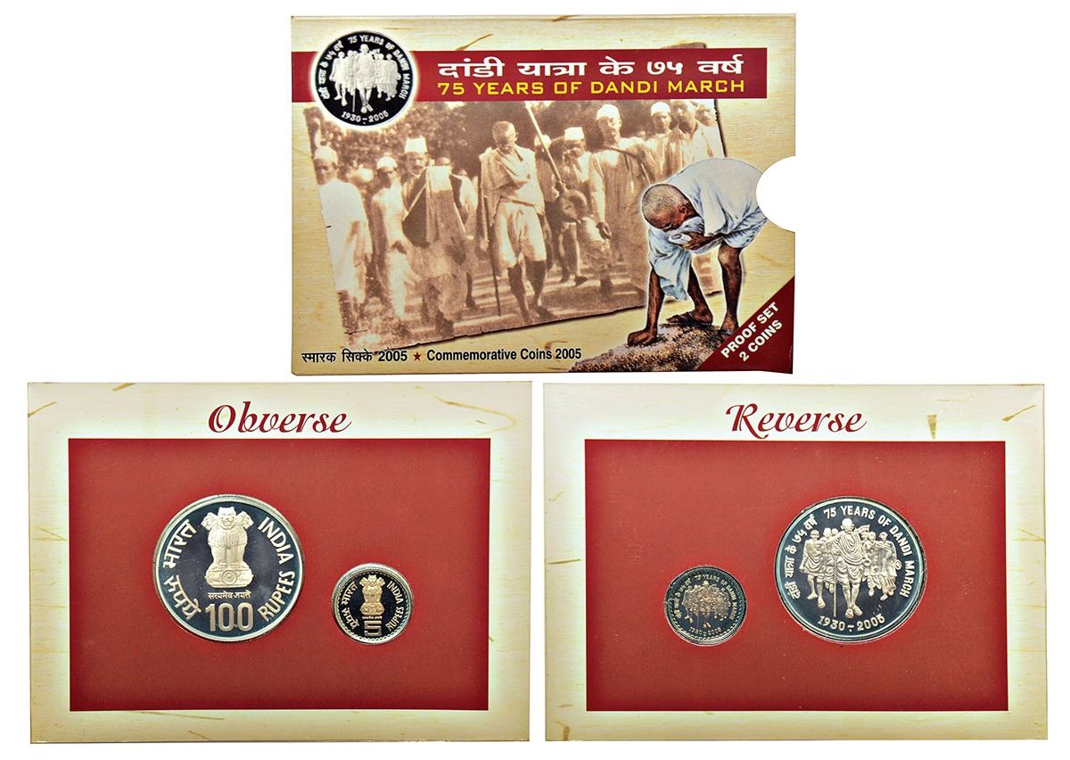 2005, 75 Years of Dandi March, Proof set of 2 coins, 100 rupees and 5 rupees, Mumbai mint, RB 287, in original mint packing.