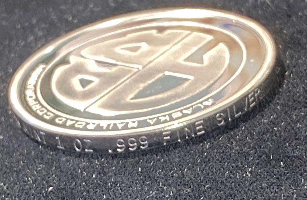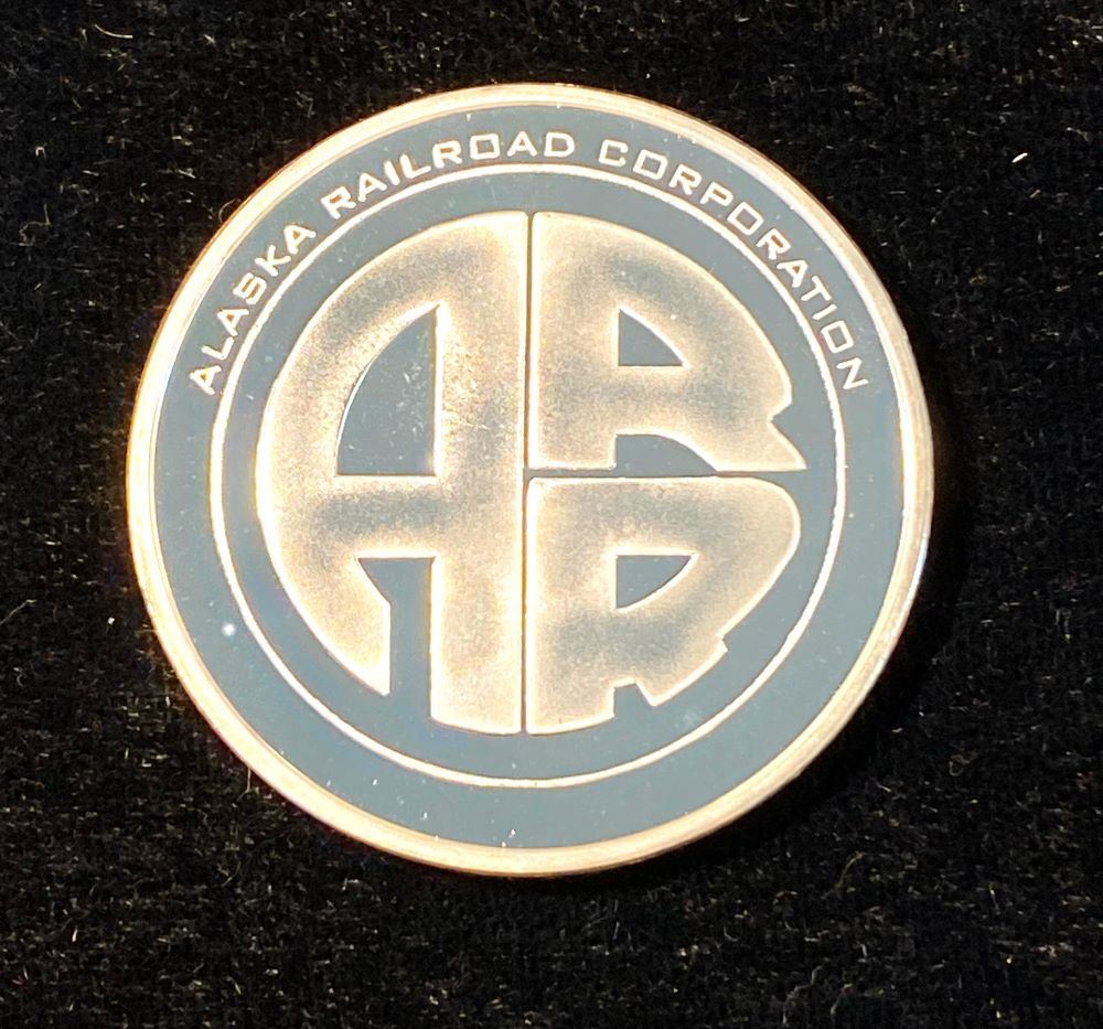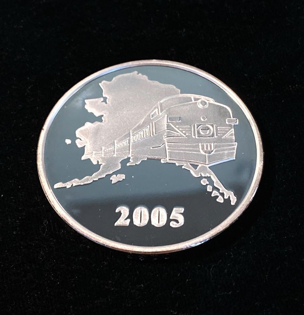 2005 Alaska Railroad Corporation 1 ozt .999 Silver Round. This round has a proof-like look and shows very slight toning on the rim which is engraved with a serial # and Alaska Mint 1 oz .999 Fine Silver. Winner shall receive exact item shown here. (JGM/B)