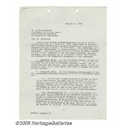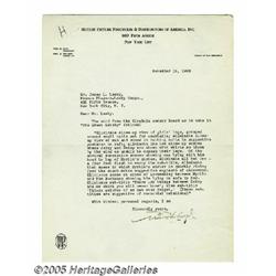 Will Hays Signed Letter to Jesse Lasky. During th