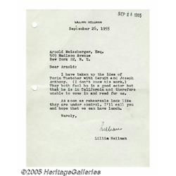 <B>Lillian Hellman Signed Letter.</B></I> A typed, signed letter, dated September 26, 1955, from popular and influential playwrigh...