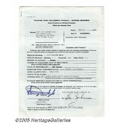 <B>Sammy Davis Jr. Signed Contract.</B></I> Here is a standard AFTRA engagement contract engaging singer and actor Sammy Davis Jr....