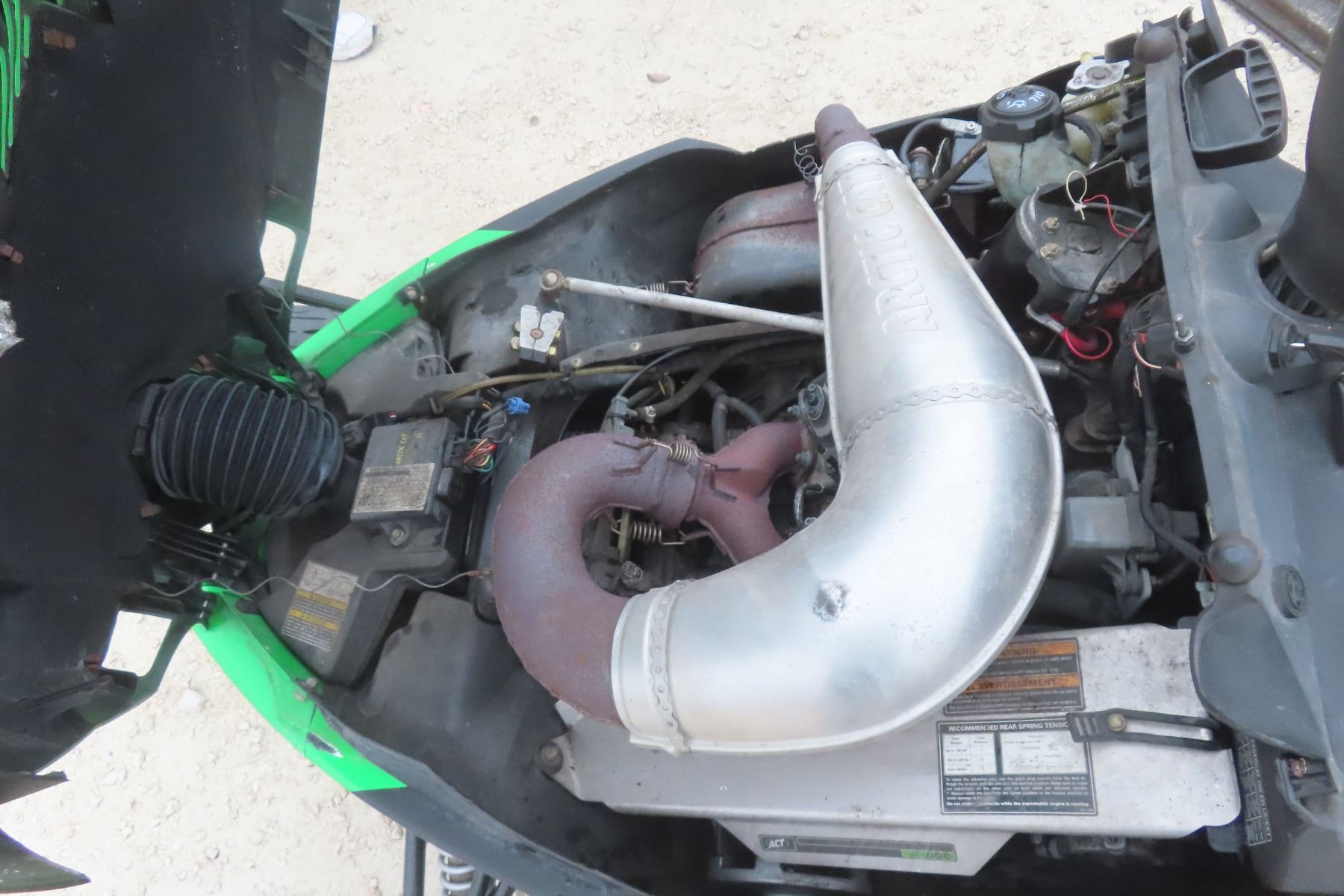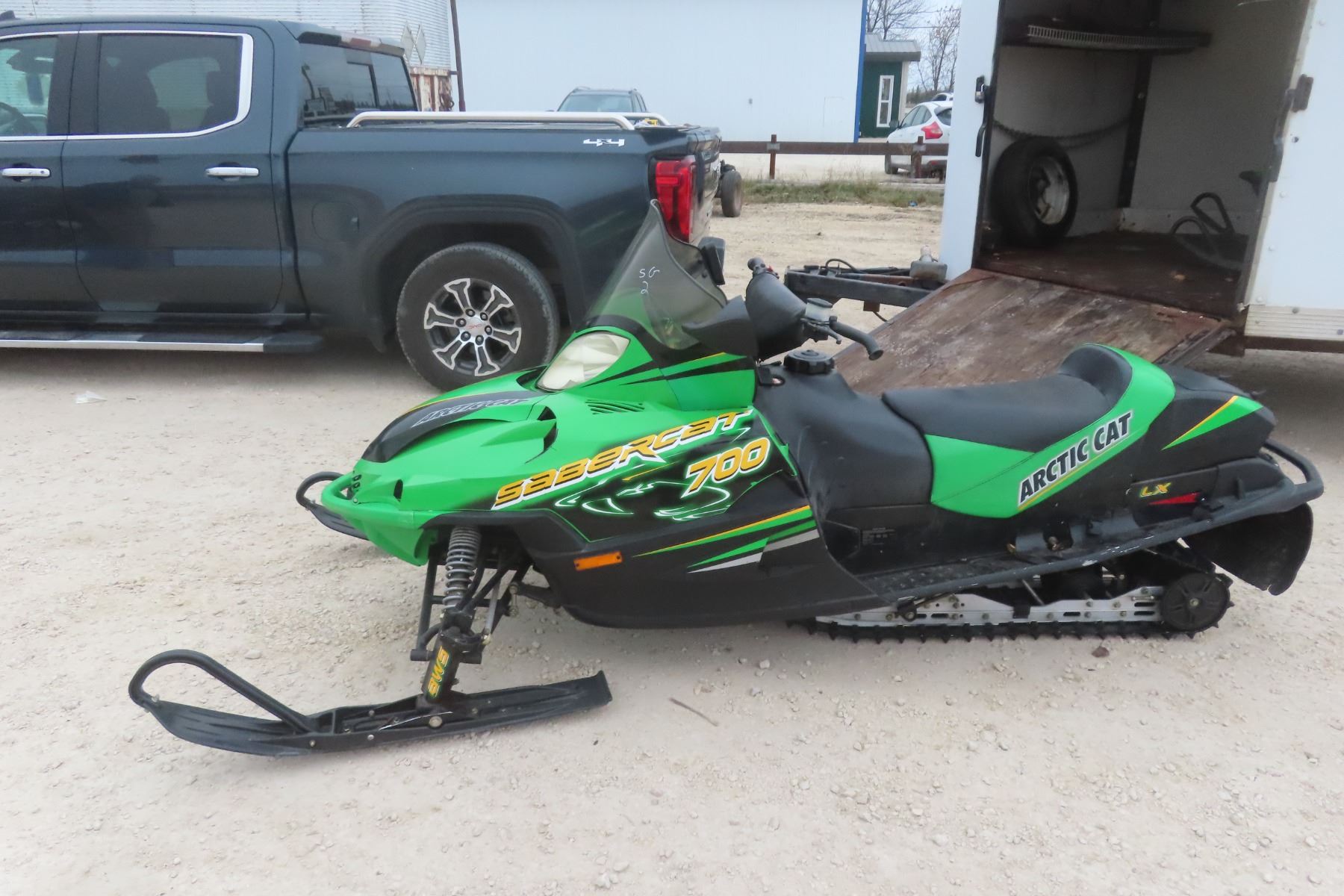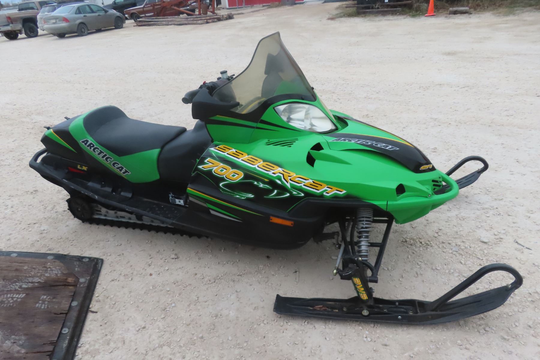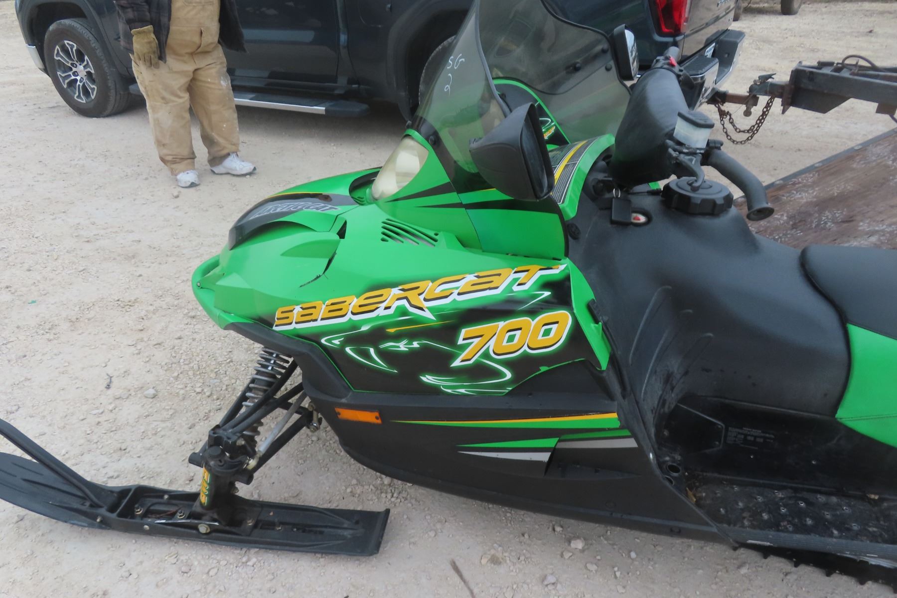 2005 Arctic Cat 700 LX SaberCat featuring a liquid-cooled 700cc engine and Arctic Cat’s performance trail chassis. Equipped with reverse, remote start system, and a combination analog speedometer with digital display for trip and engine information. Includes hand controls, rider-forward ergonomics, and SaberCat graphics package. Odometer shows approximately 6000 miles. Requires battery.