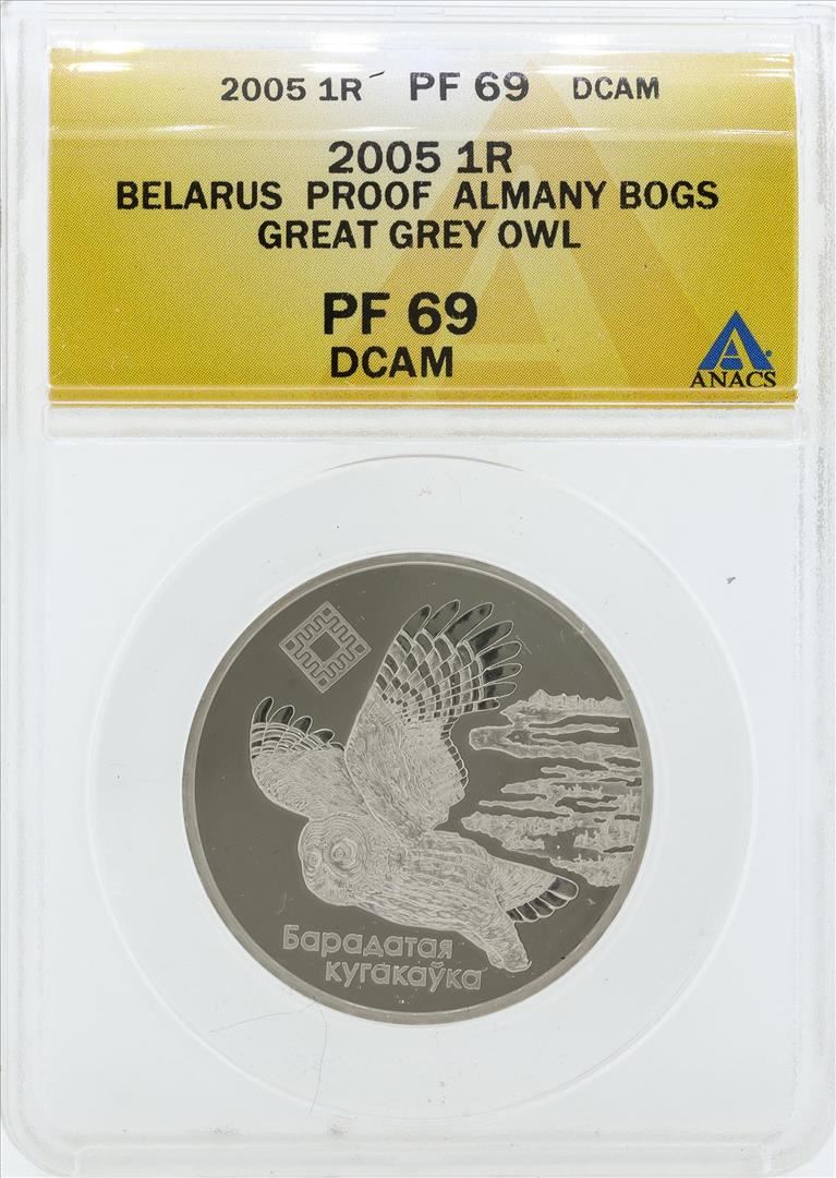 One 2005 Belarus Ruble Proof Slmany Bogs Great Owl Coin ANACS PF69 DCAM. ANACS Certified.