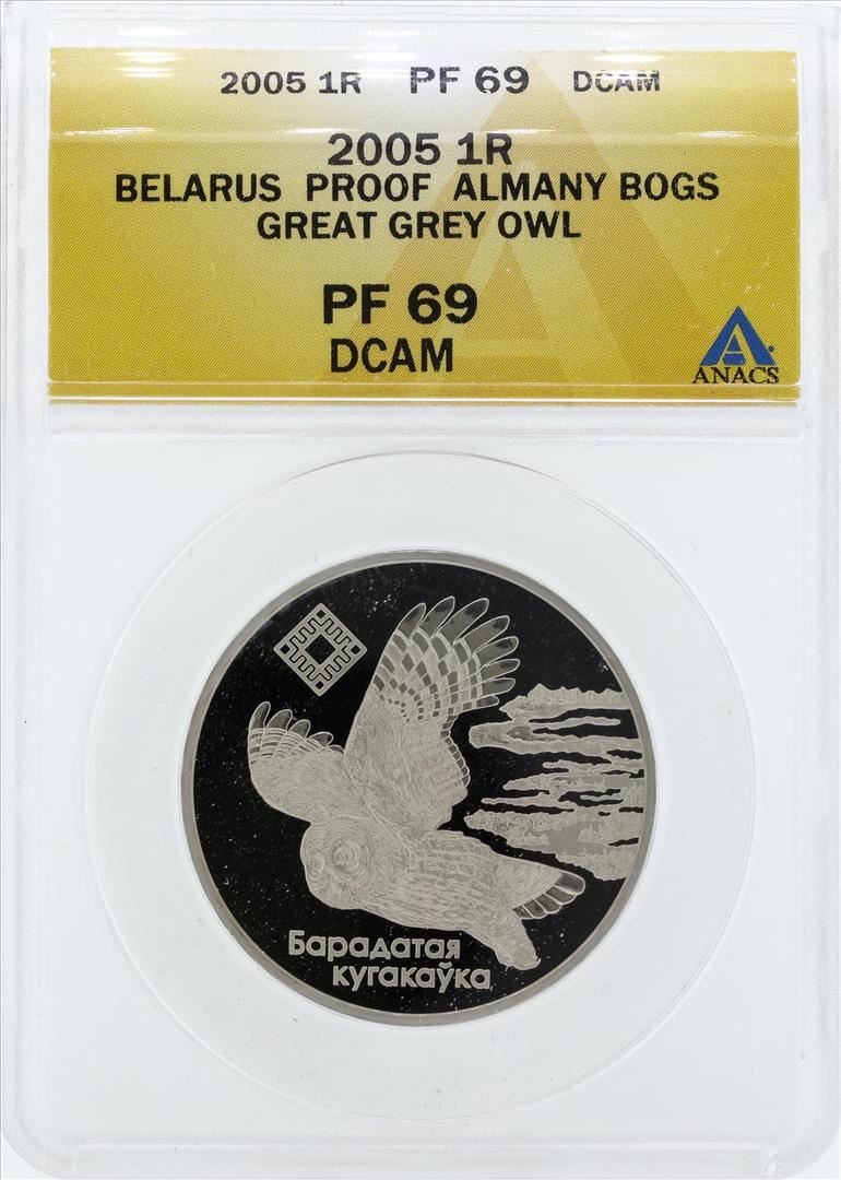 One 2005 Belarus Ruble Proof Slmany Bogs Great Owl Coin ANACS PF69 DCAM. ANACS Certified.