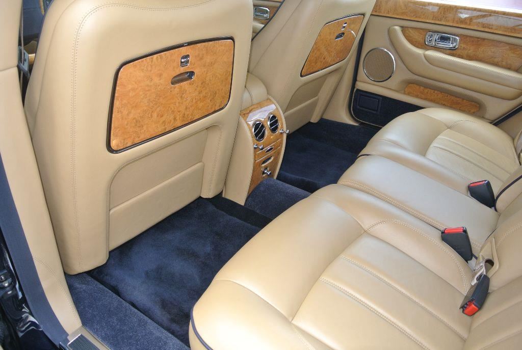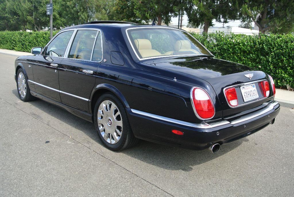 Lovely 2005 Bentley Arnage R Black Sapphire exterior with Orche leather interior and Dark Navy piping and carpets. Original Bentley Press car, and 1 owner car. Well serviced with tons of records all from the dealer since day one. Loaded with options such as: full wood veneered door panels, veneered rear vanity mirrors, Navigation, wood and leather steering wheel, chrome wheels, two umbrellas (still in the plastic) , sheepskin floor mats, sunroof, rear picnic tables, heated and power rear seats, seat piping, exterior chrome package, park sensors, manual books and so much more! Drives incredible and the coloring alone make this Arnage a true beauty! 43,684 miles. Vin # SCBLC37F85CX10840.