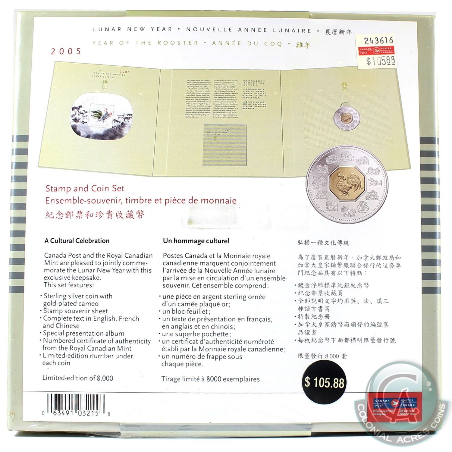 2005 Canada $15 Year of the Rooster Sterling Silver and Gold Plated Cameo Coin and Stamp Set with all Original Packaging from the RCM and Canada Post. *still sealed*