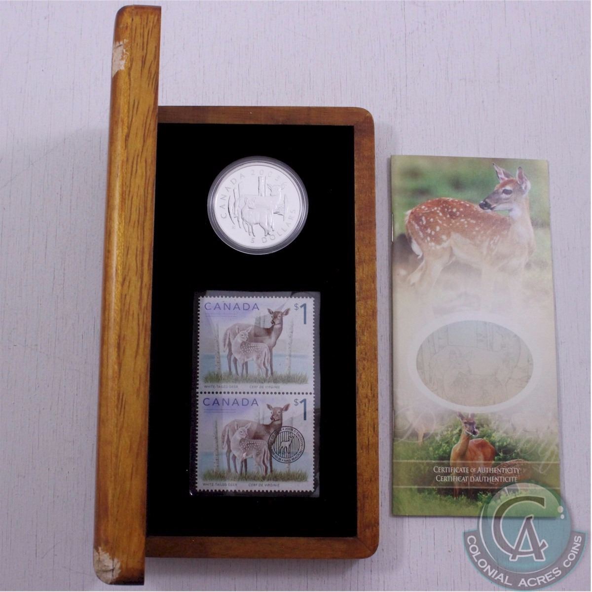 2005 Canada $5 Deer & Fawn Coin And Stamp Set. Coin comes encapsulated with stamps and COA in a wooden display case. Please note that the outer case is impaired. Please view image.