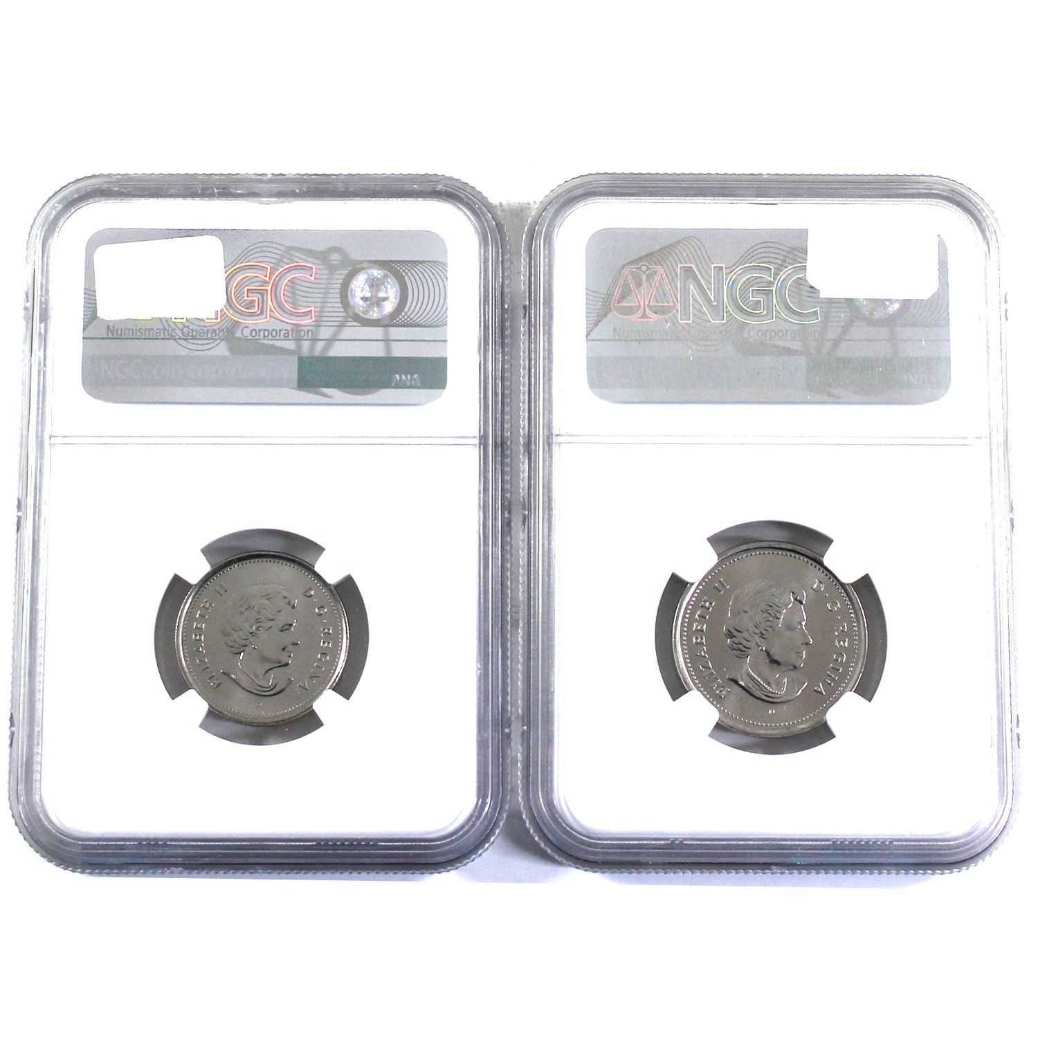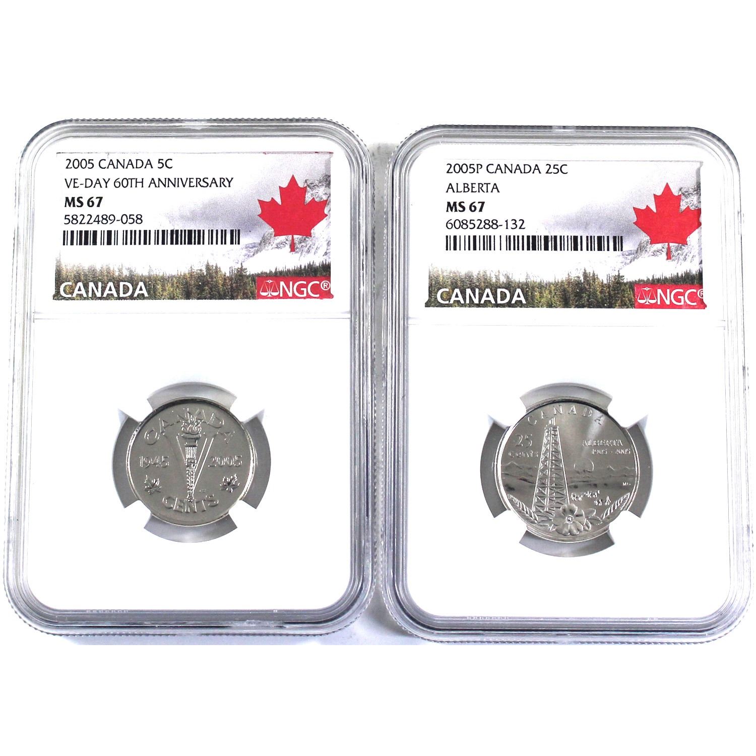 2005 Canada 5-cent VE-Day & 2005P 25-cent Alberta NGC Certified MS-67. 2pcs
