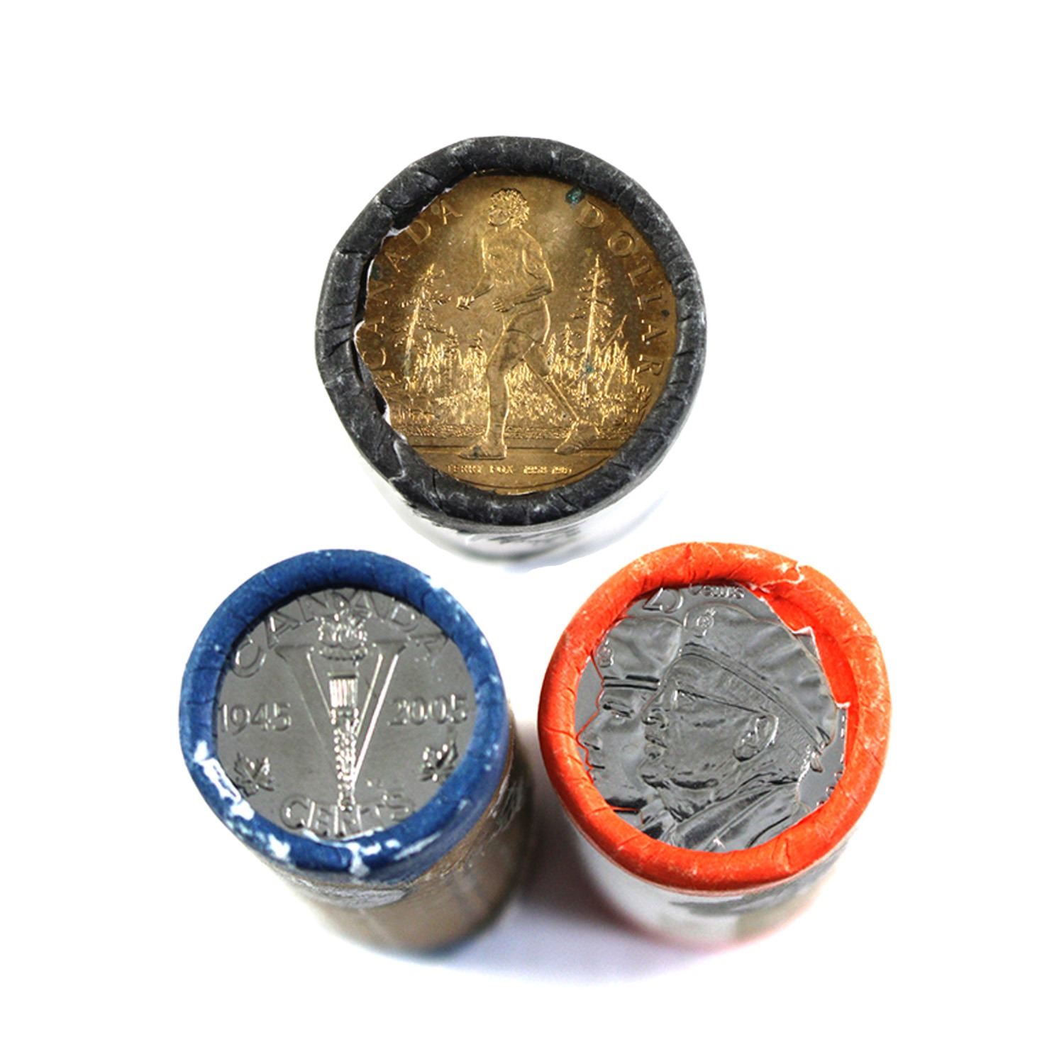 2005 Canada 5-cent Victory Special Wrap, 25-cent Veterans Special Wrap & $1 Terry Fox Original Rolls (5-cent roll has some surface tears & $1 roll has writing). 3 rolls