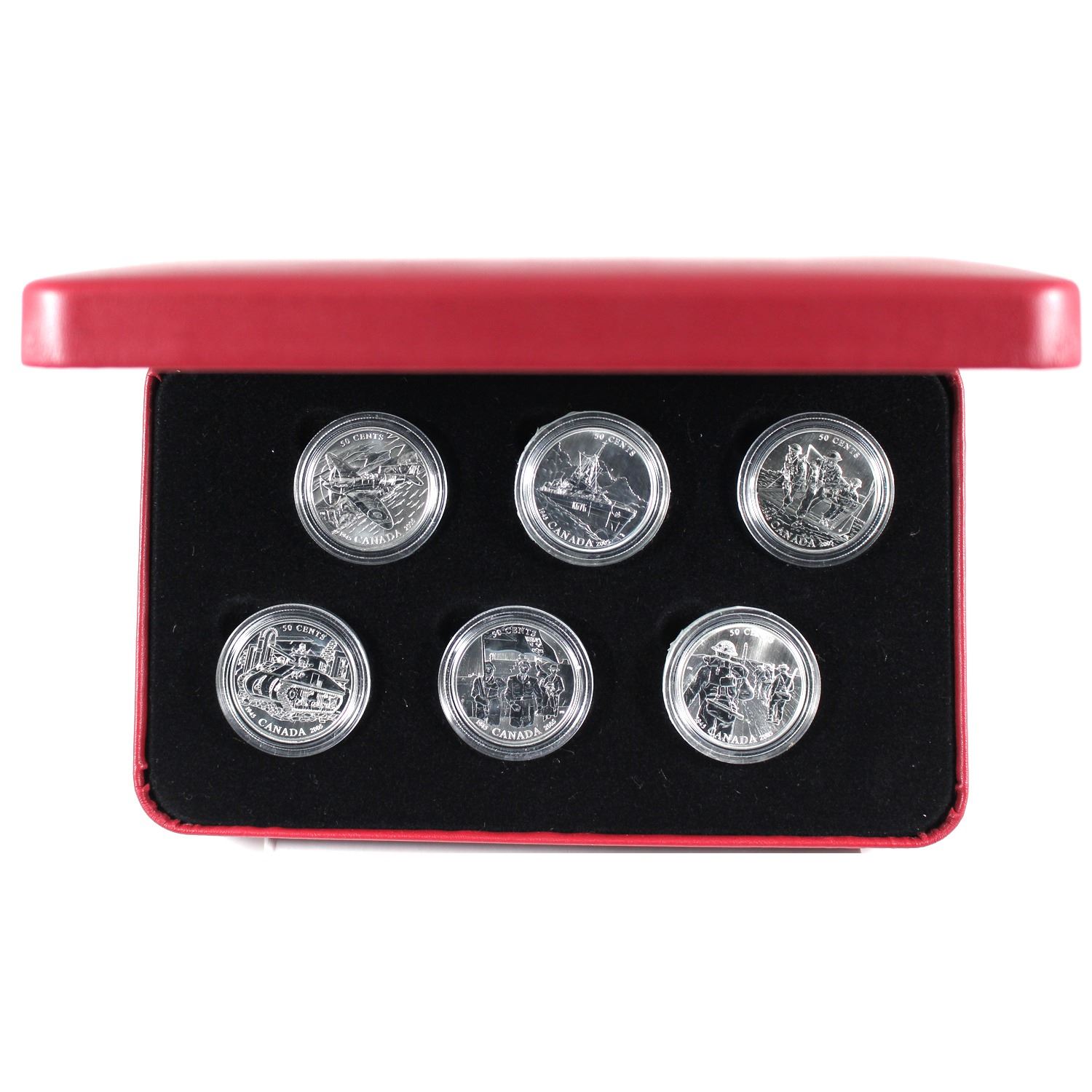 2005 Canada 50-cent Battle of Britain 6-coin Sterling Silver Set. Outer cardboard sleeve is worn. Capsules have tape/residue or scuffs.