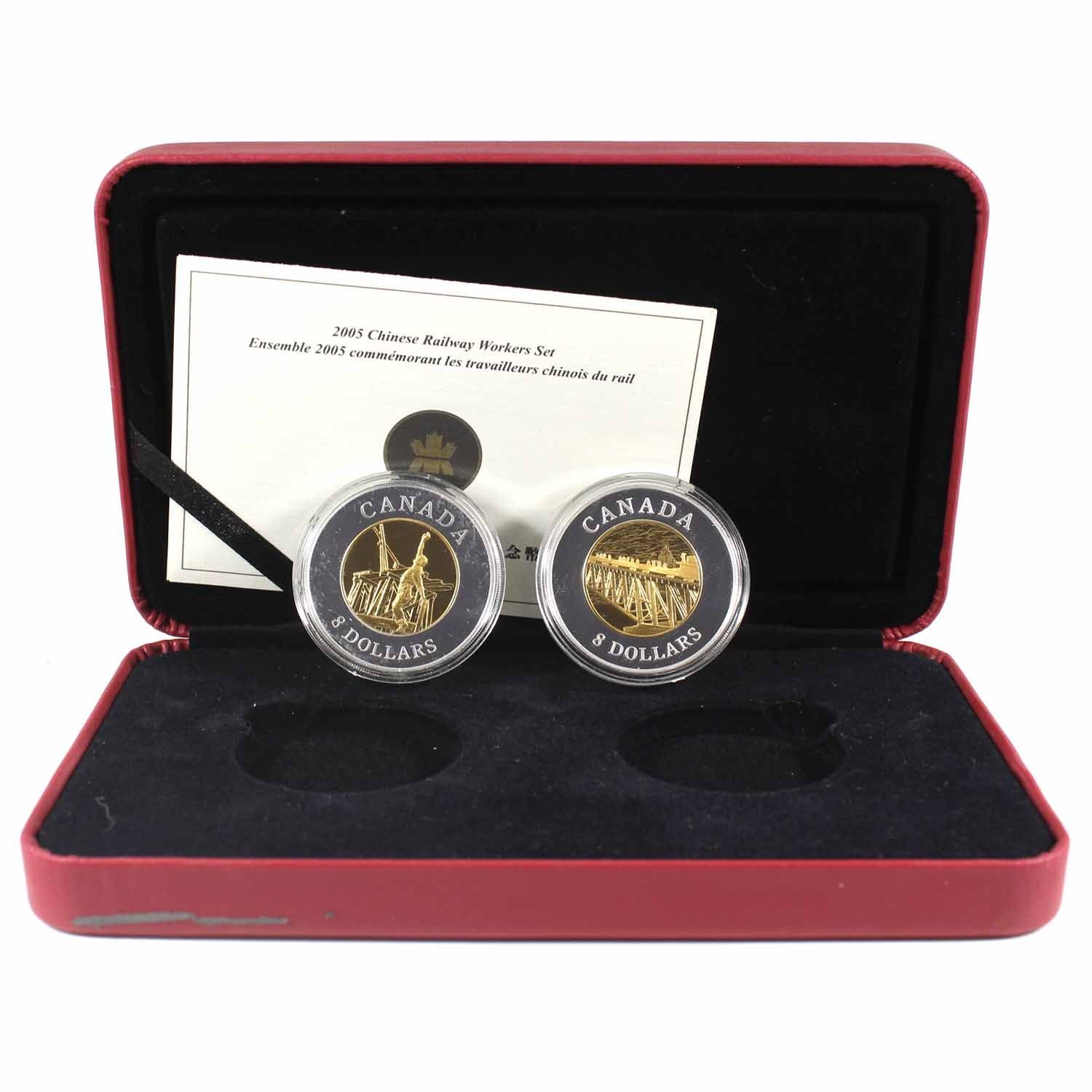 2005 Canada $8 Chinese Railway Workers Fine Silver 2-Coin Set (case has a surface tear & missing outer sleeve). TAX Exempt