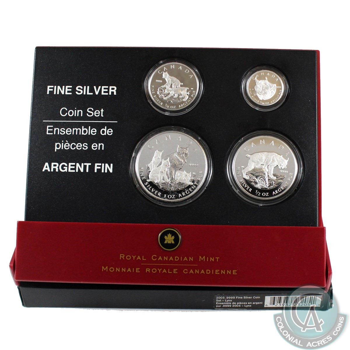 2005 Canada Fractional The Lynx .9999 Fine Silver 4-coin Set (outer sleeve lightly worn, 1oz coin is lightly toned & 1/2oz coin capsule has two light scratches on the back) TAX Exempt