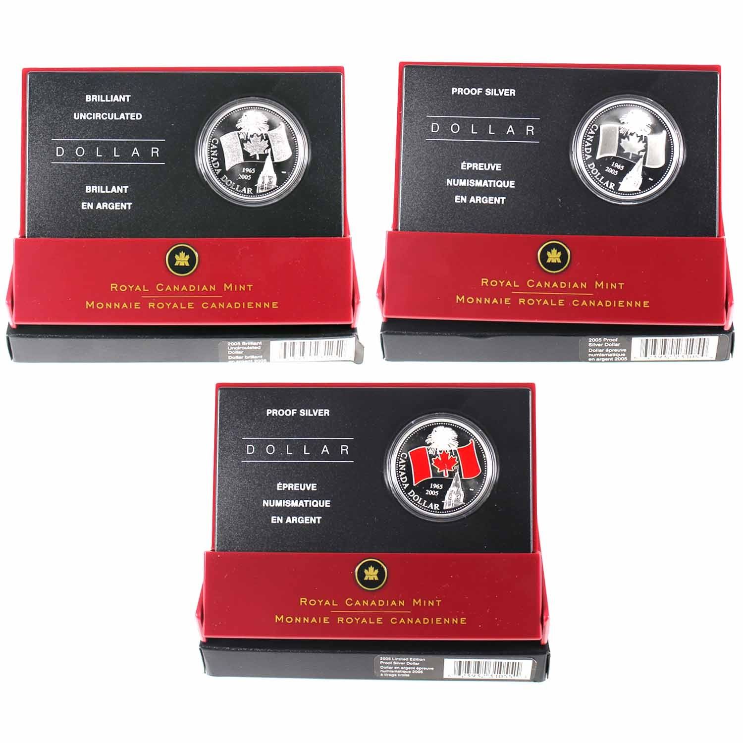 2005 Canada Silver Dollars - Brilliant Uncirculated, Proof & Enameled Proof Versions (light scratches on capsules). 3pcs (TAX Exempt)